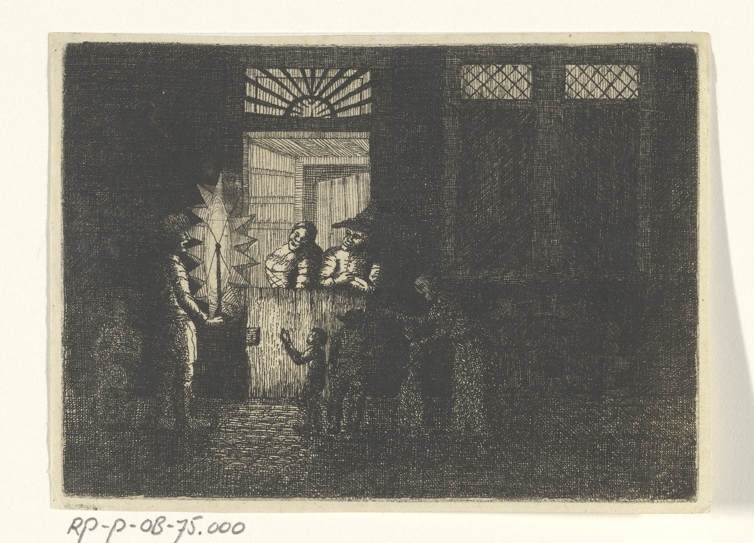 Man met lantaarn en zijn gezin in een mand op zijn rug