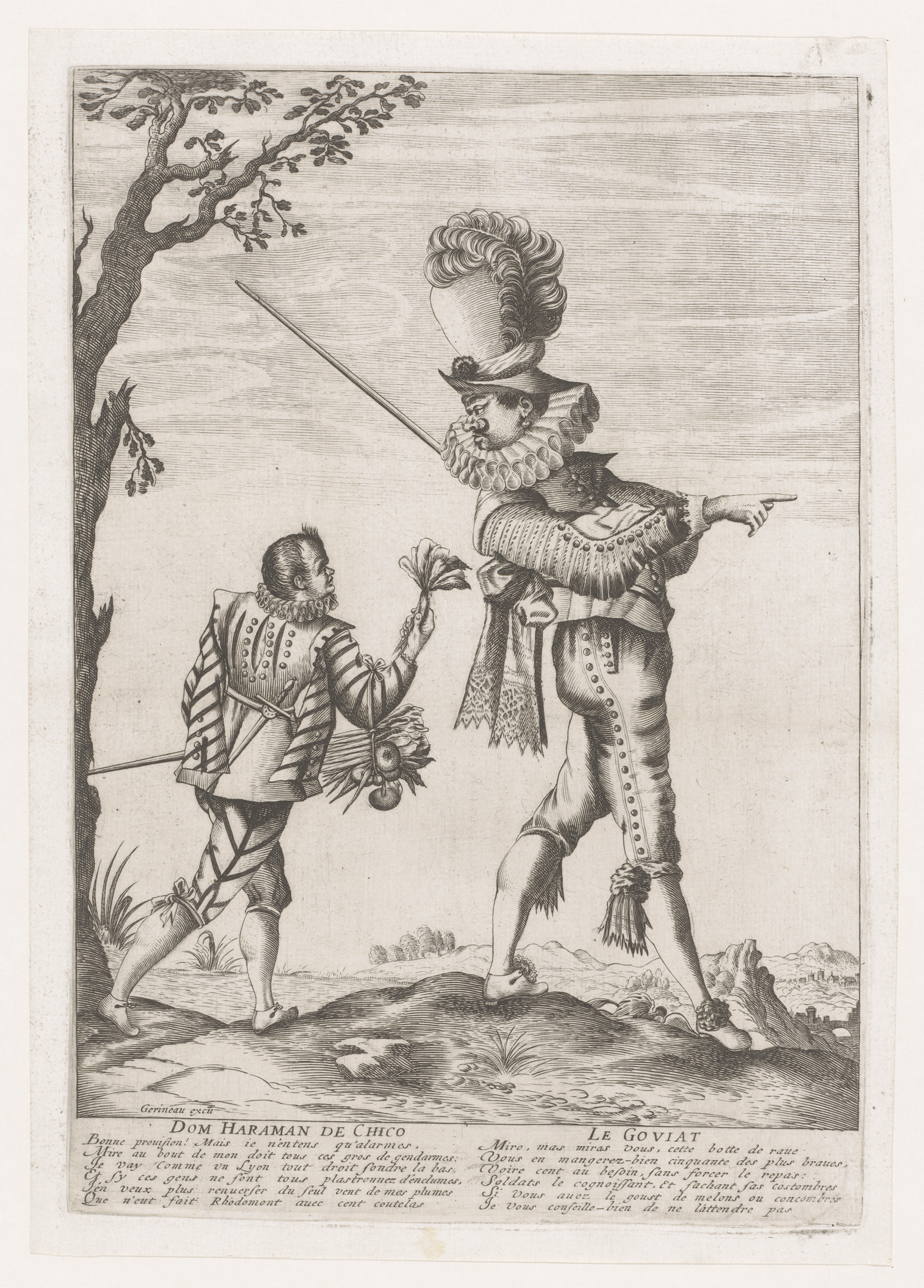 Edelman met bril, zwaard en pijp in de hand een pas ...