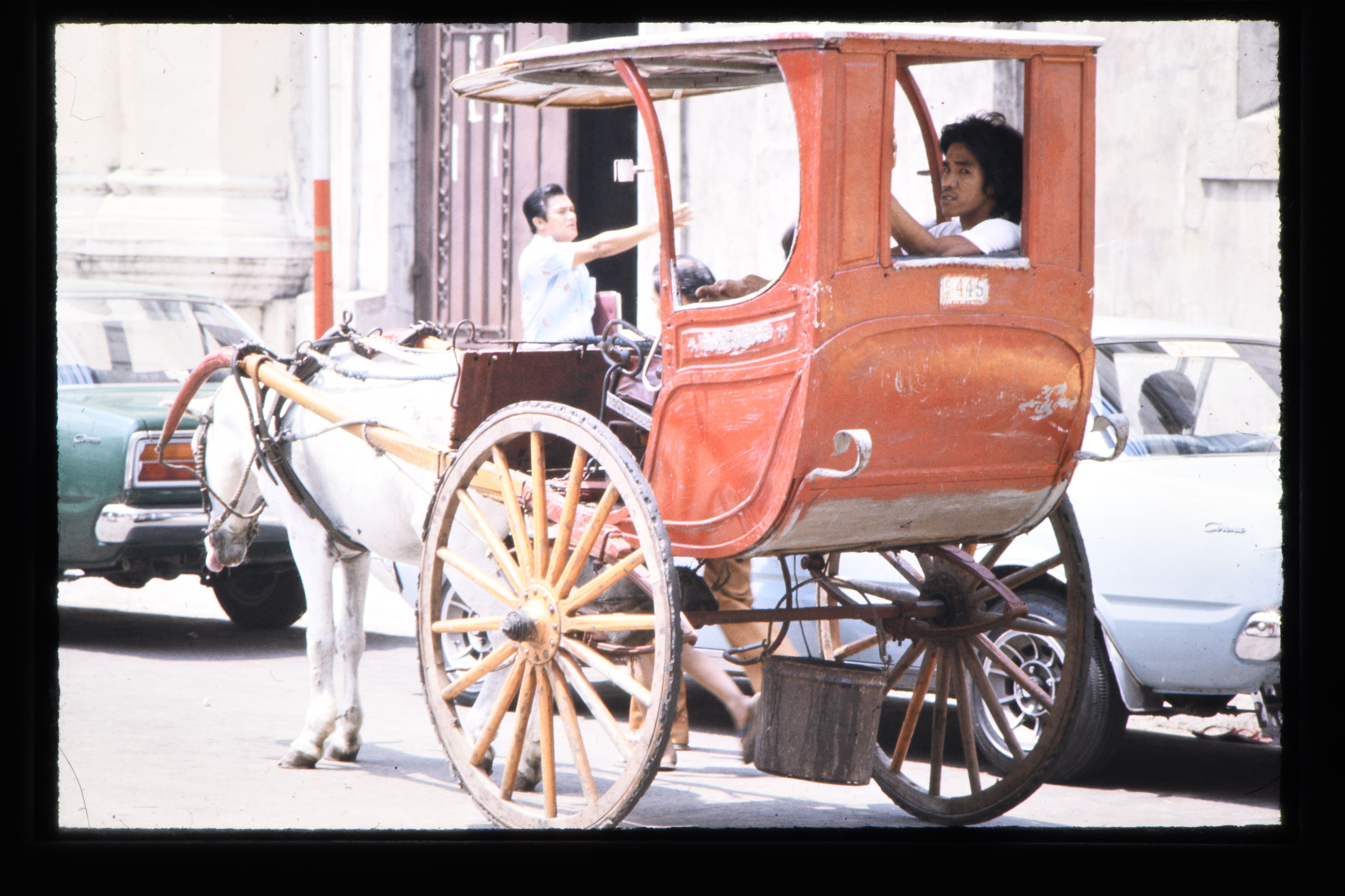 '"Fiacre", tweewielig rijtuig getrokken door een paa...