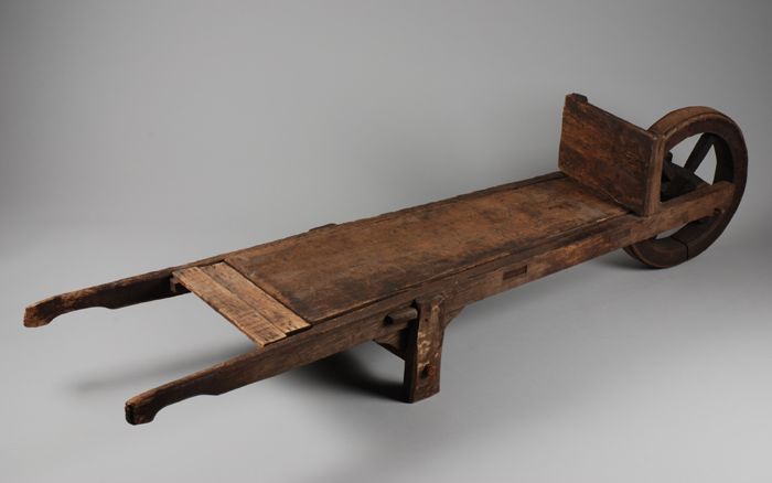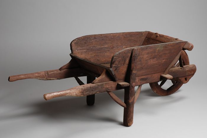 Houten kruiwagen met kuipvormige bak en houten wiel