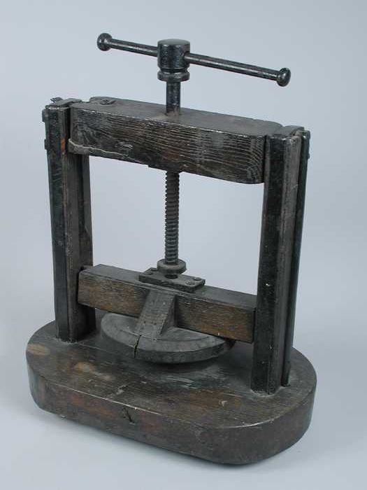Zware houten kaaspers met vijzelschroef
