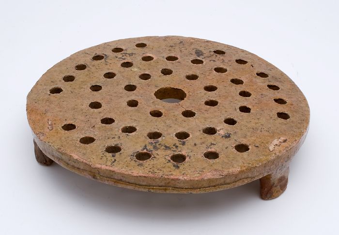 Aardewerk aardappelrooster op drie poten, geglazuurd