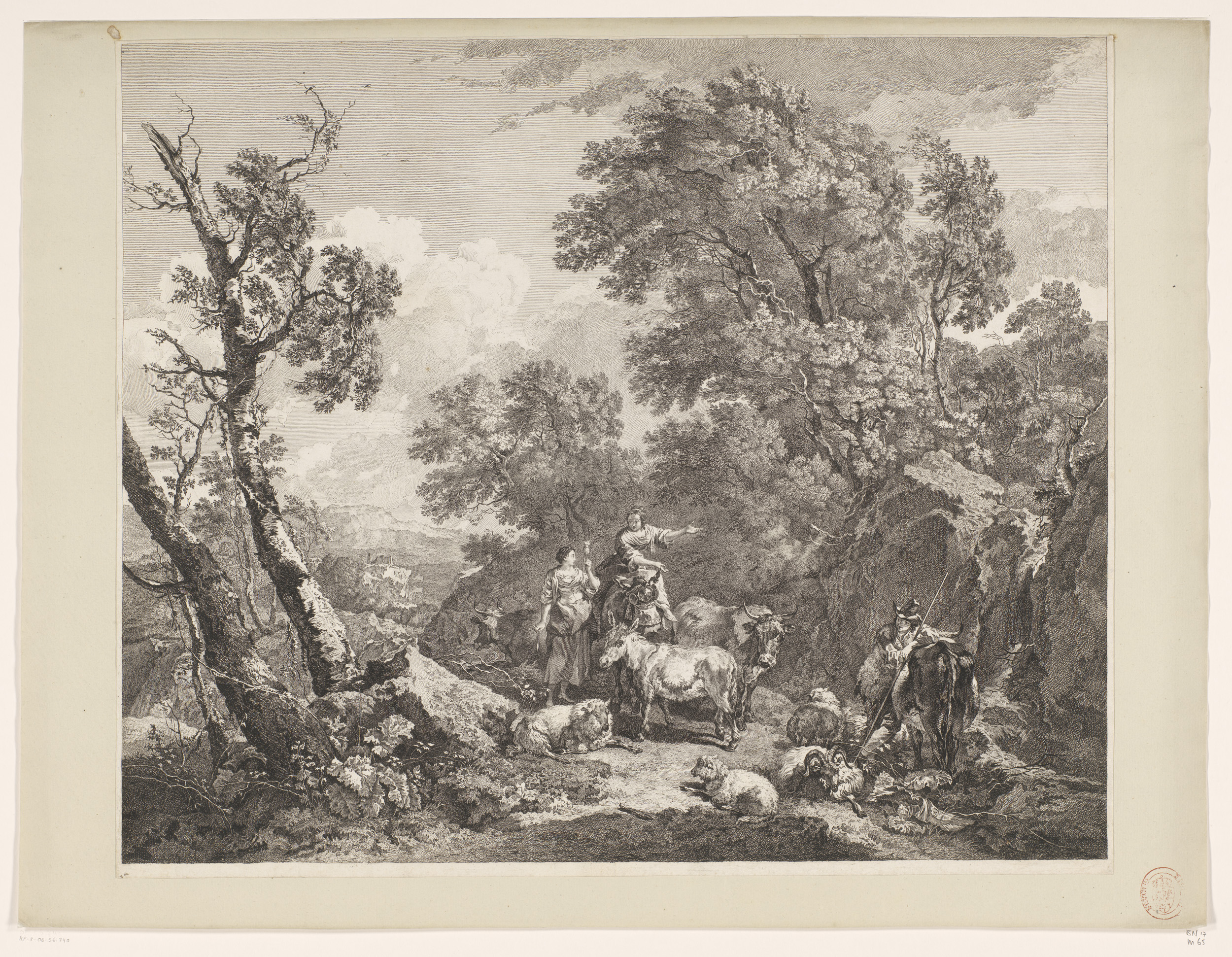 Landschap met twee herderinnen, een herder en hun kudde