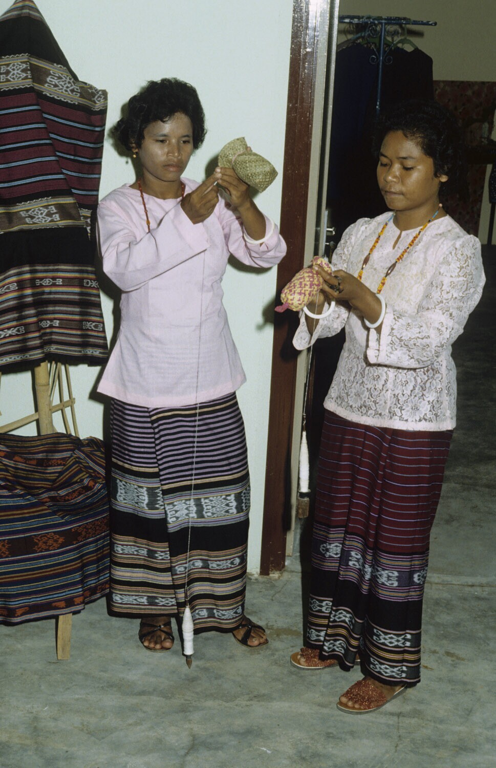 Een demonstratie van Tanimbar ikat weefsels op de ta...