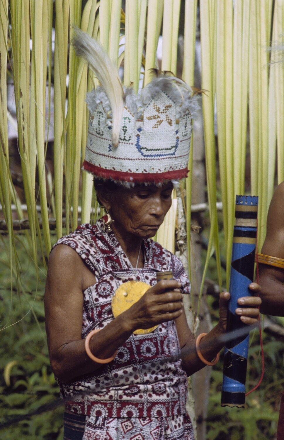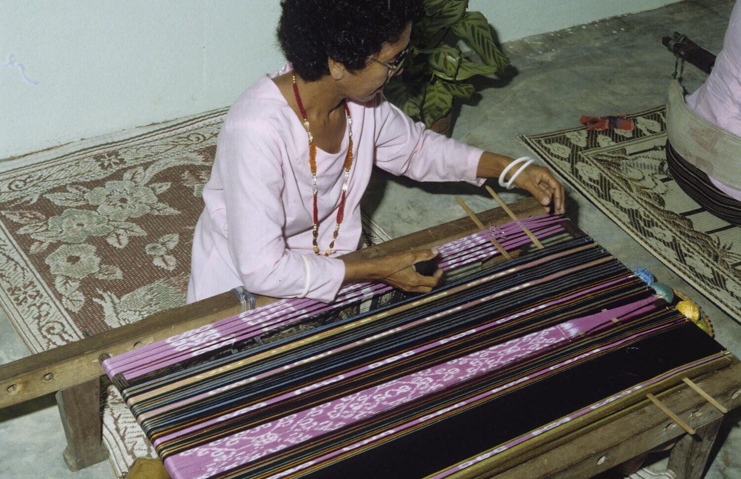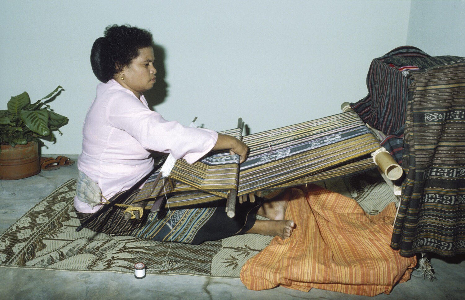 Een vrouw is bezig met het weven van een 'Tanimbar k...