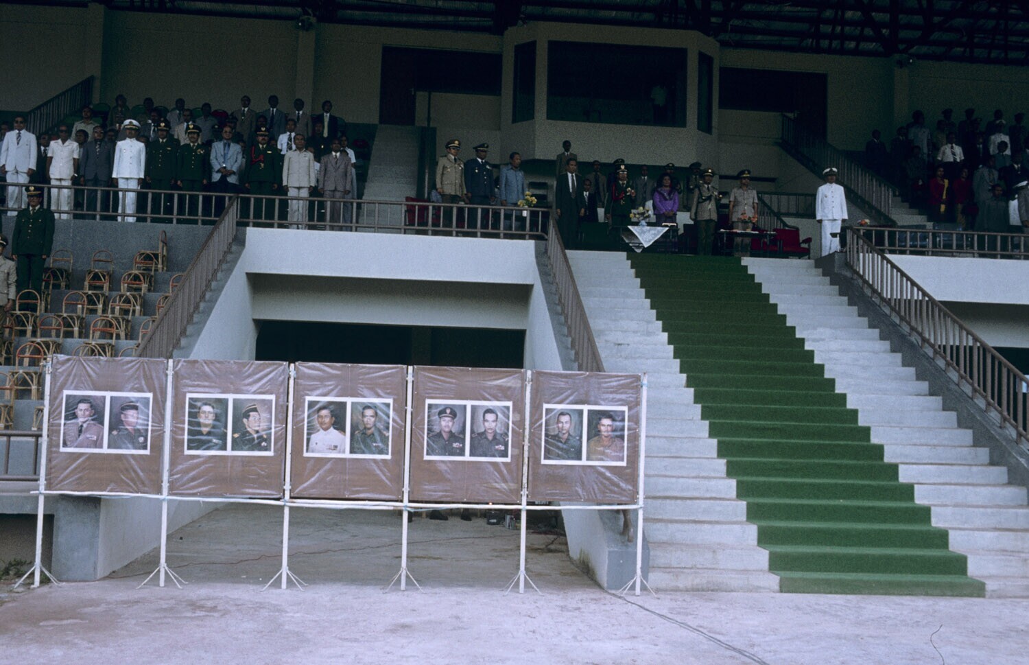 De eretribune met op de voorgrond portretten waarsch...