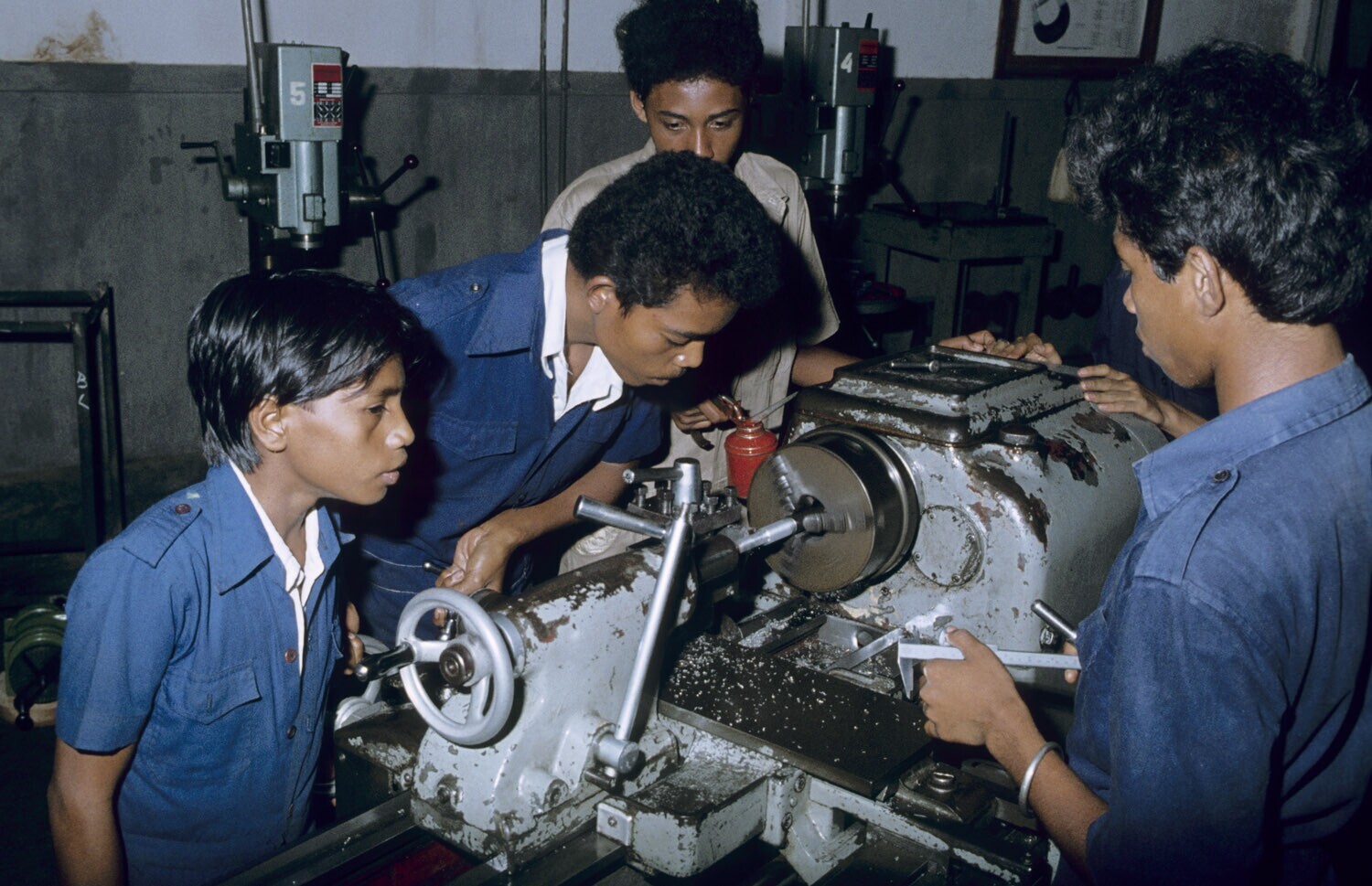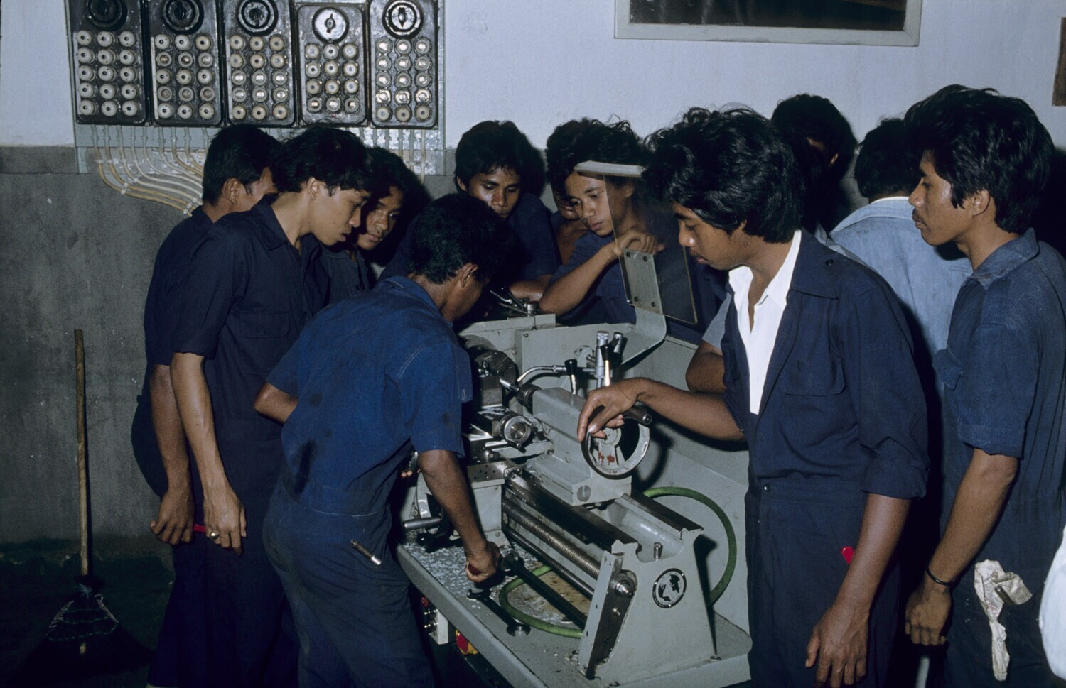 Leerlingen van de technische school aan de draaibank...
