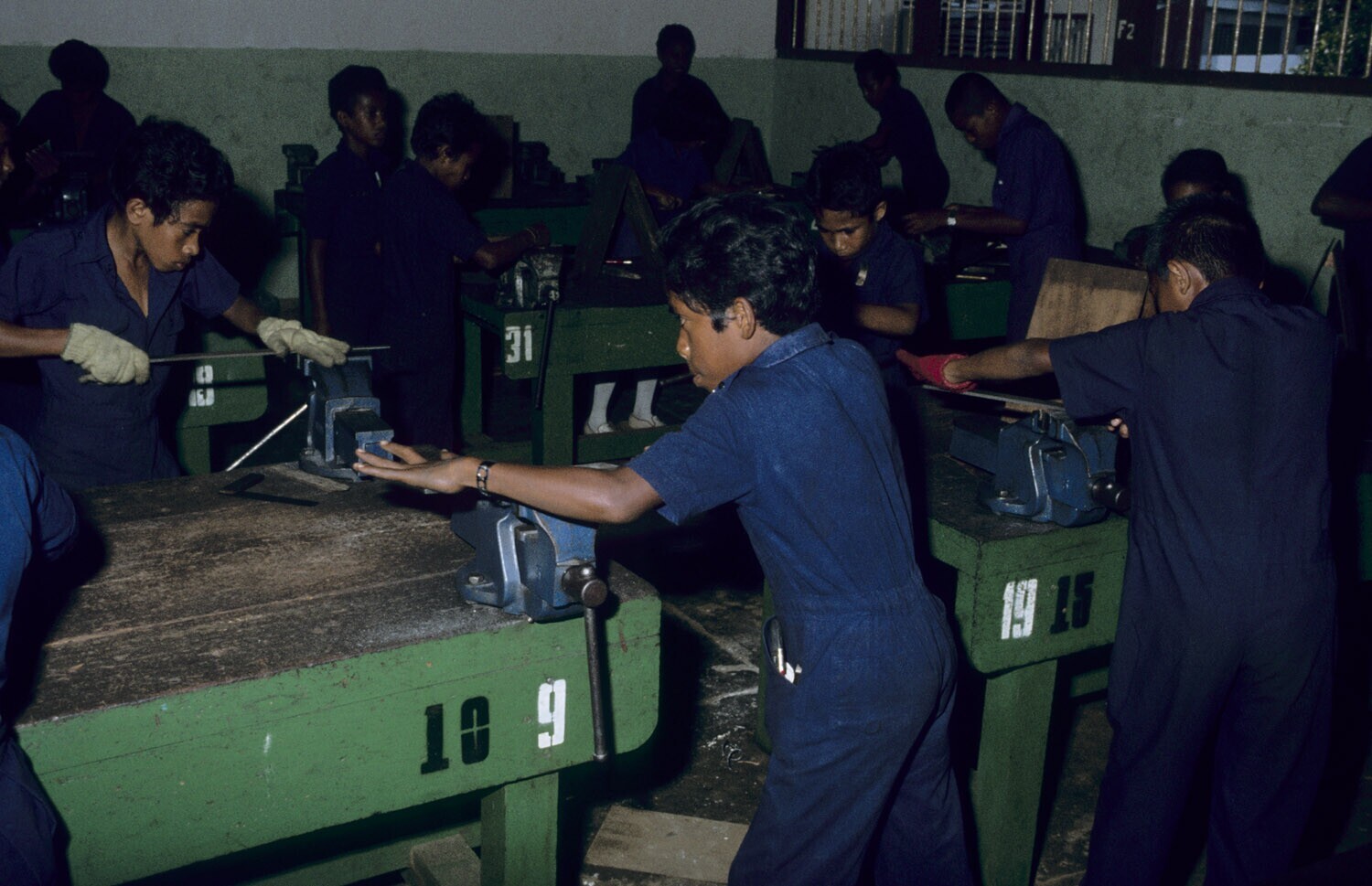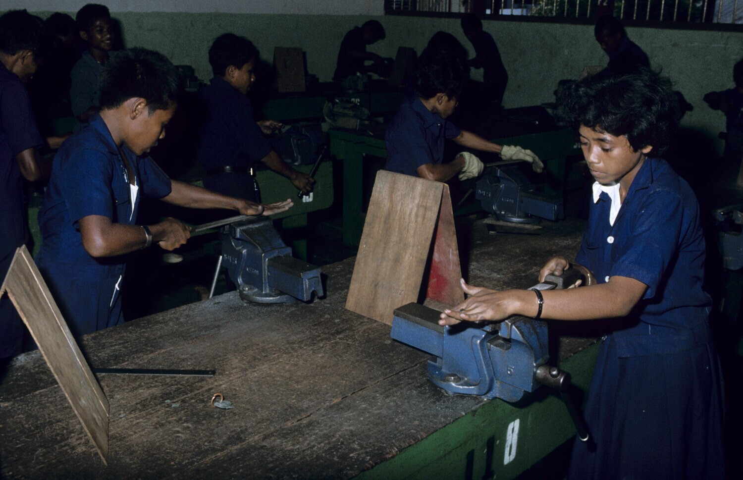 Leerlingen van de technische school aan het vijlen. ...