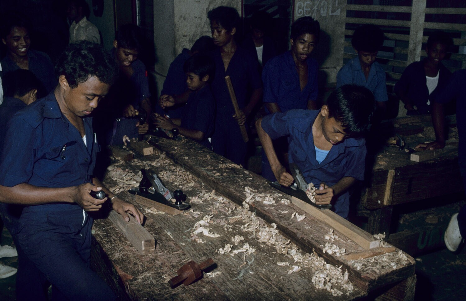 Leerlingen van de technische school in de timmerwerk...