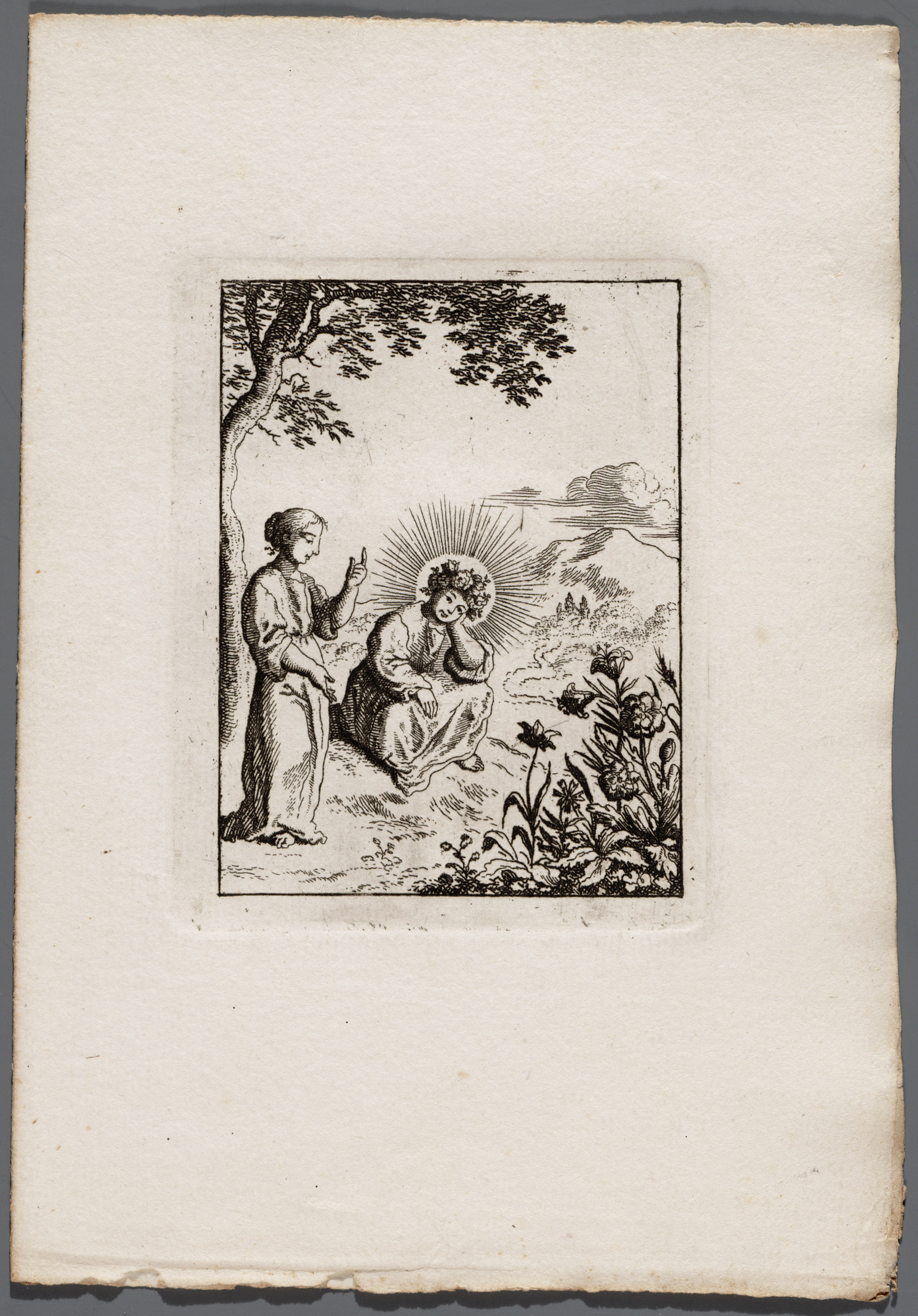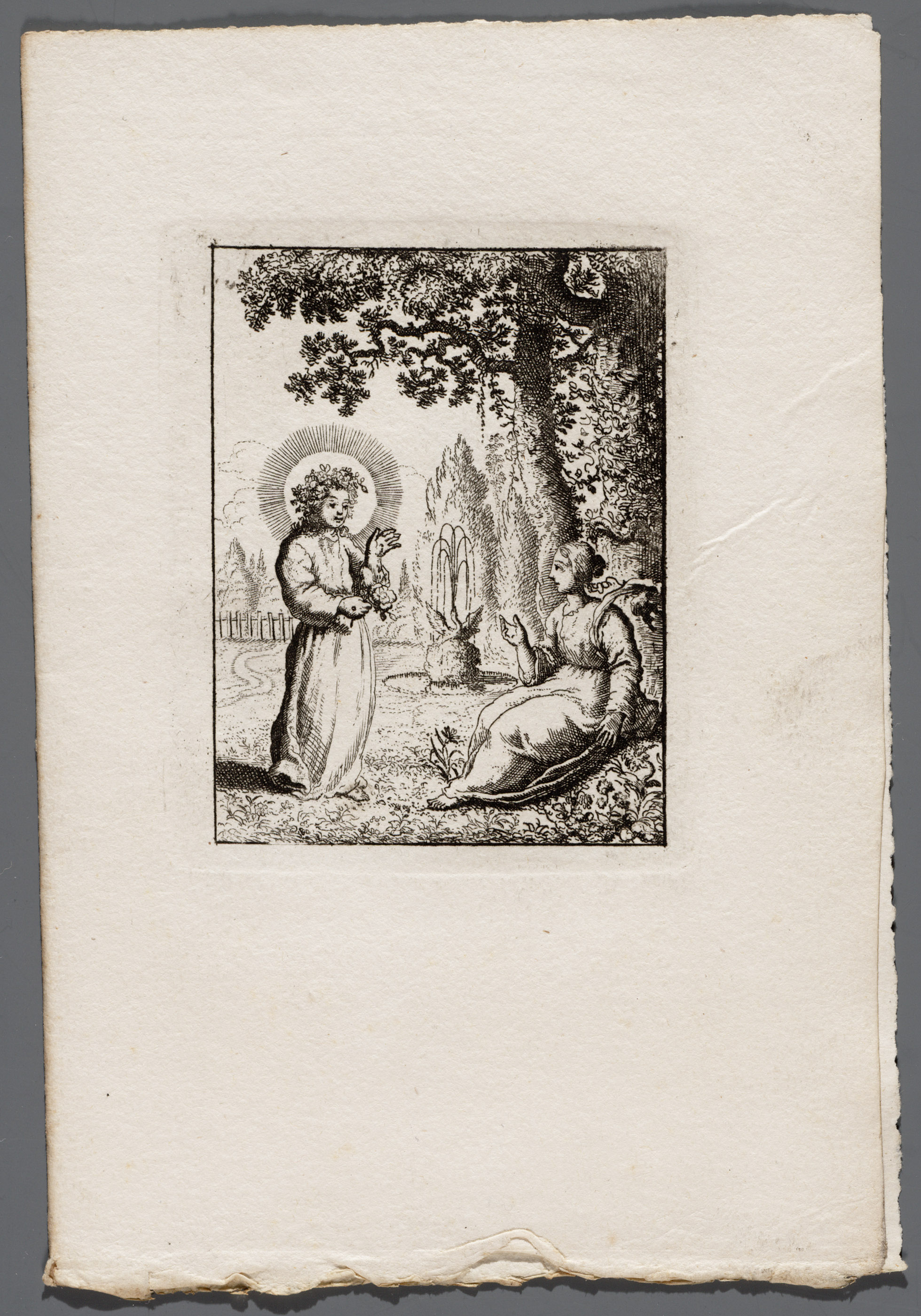 Jezus en de ziel in een bloemhof bij eene fontein