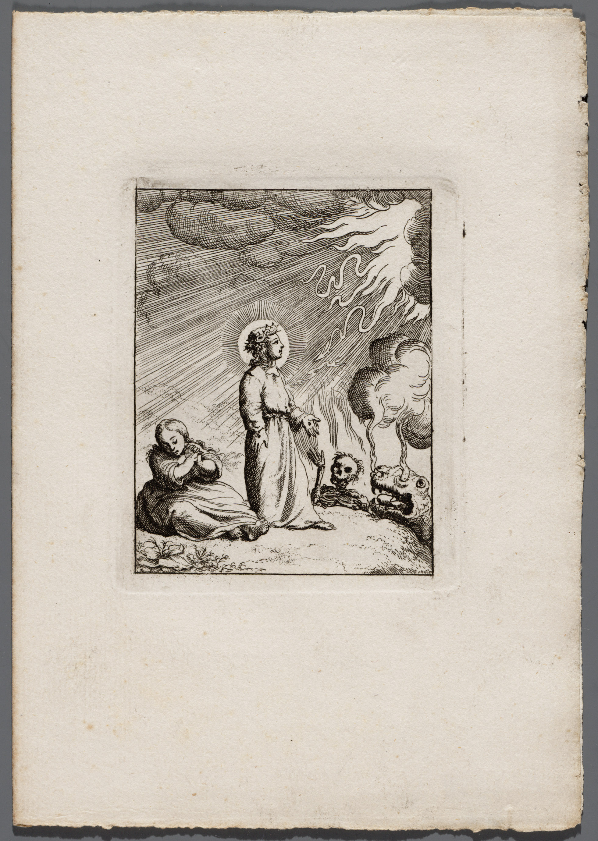 Jezus met de ziel, die geheel door vlammen wordt omr...