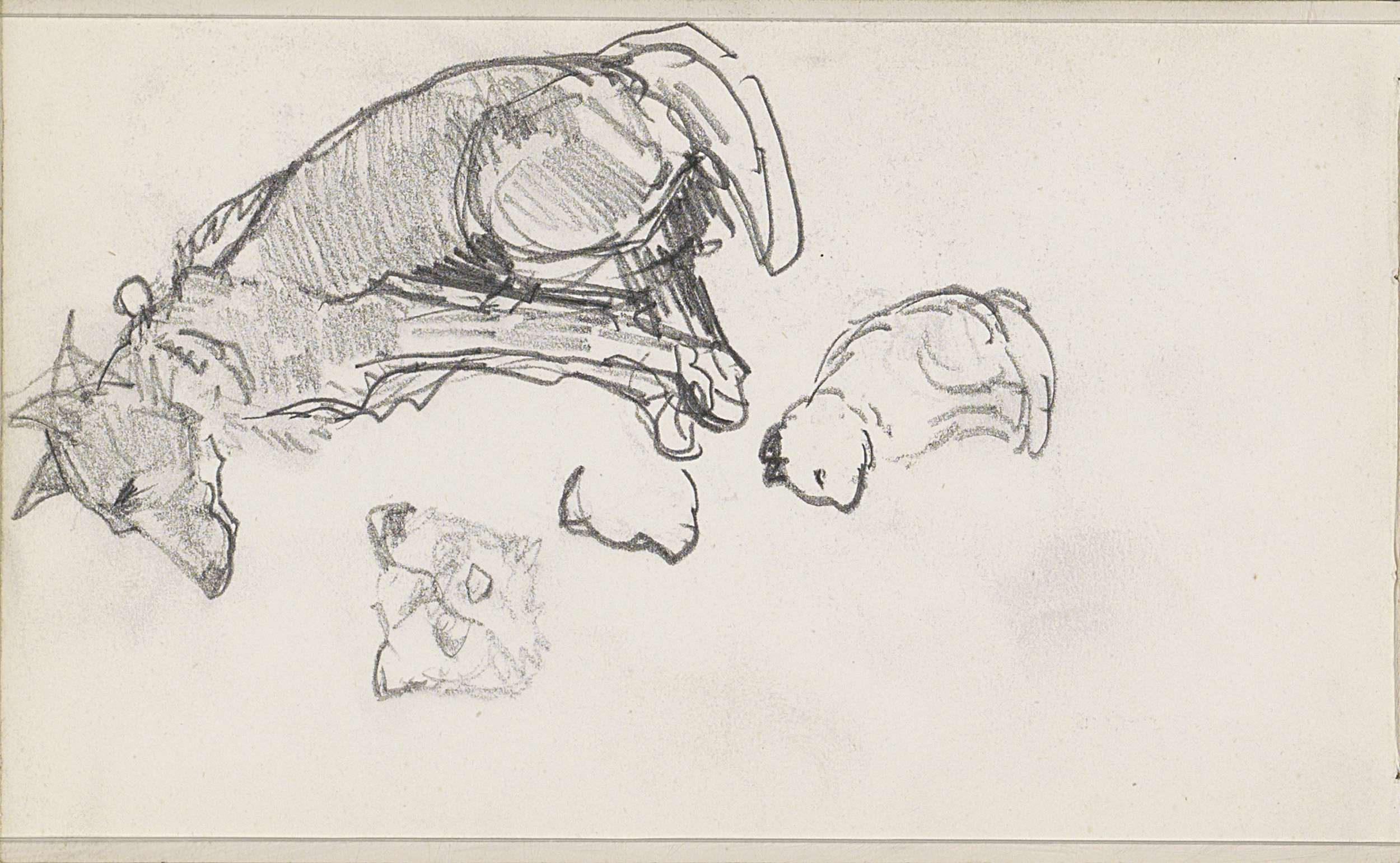 Zittende herdershond, een kat en een kattenkop