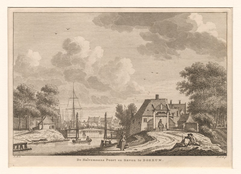 Gezicht op de Halvemaanspoort en Haven te Dokkum