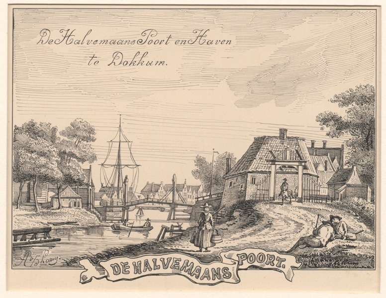 Gezicht op de Halvemaans Poort en Haven te Dokkum