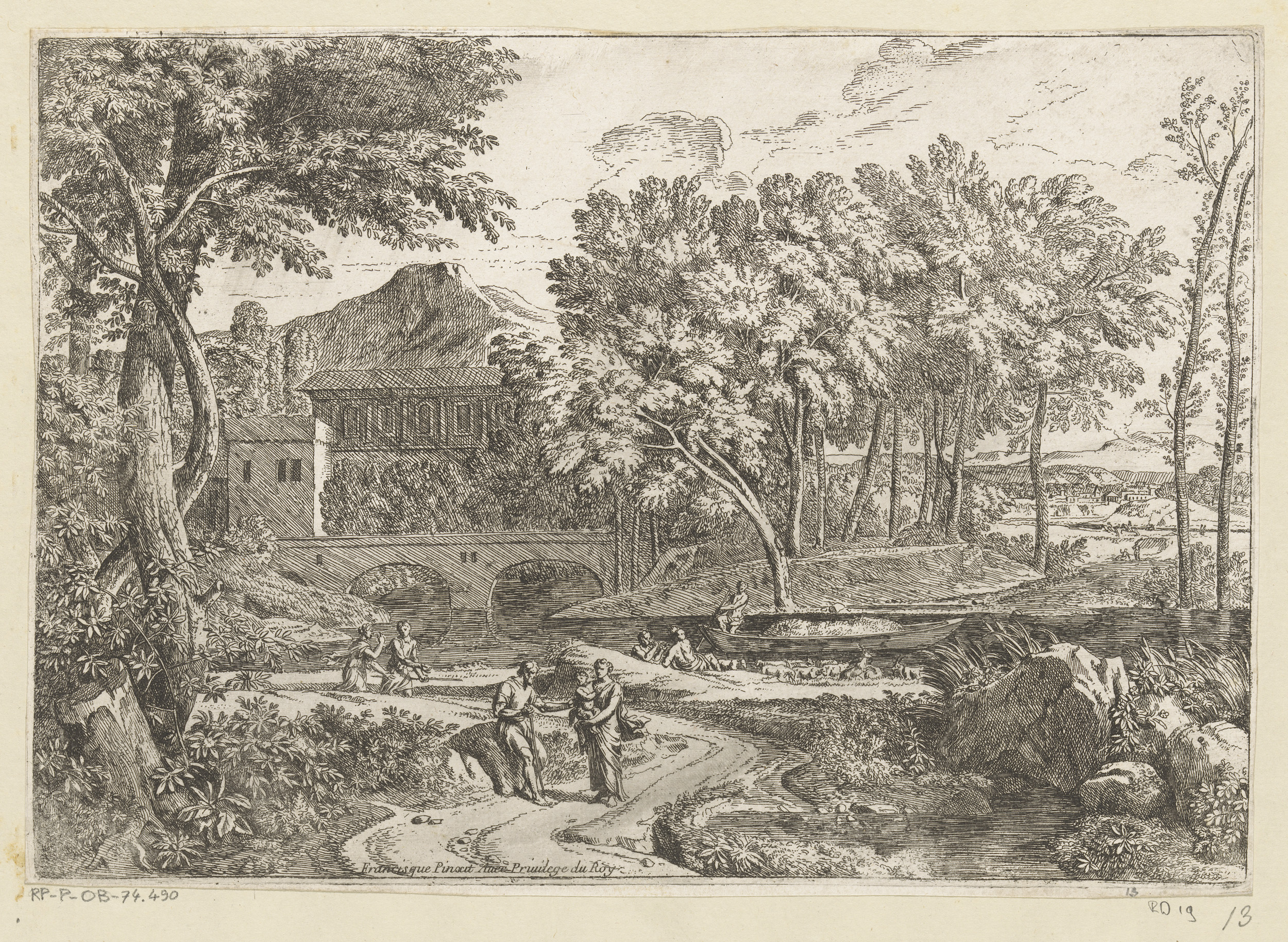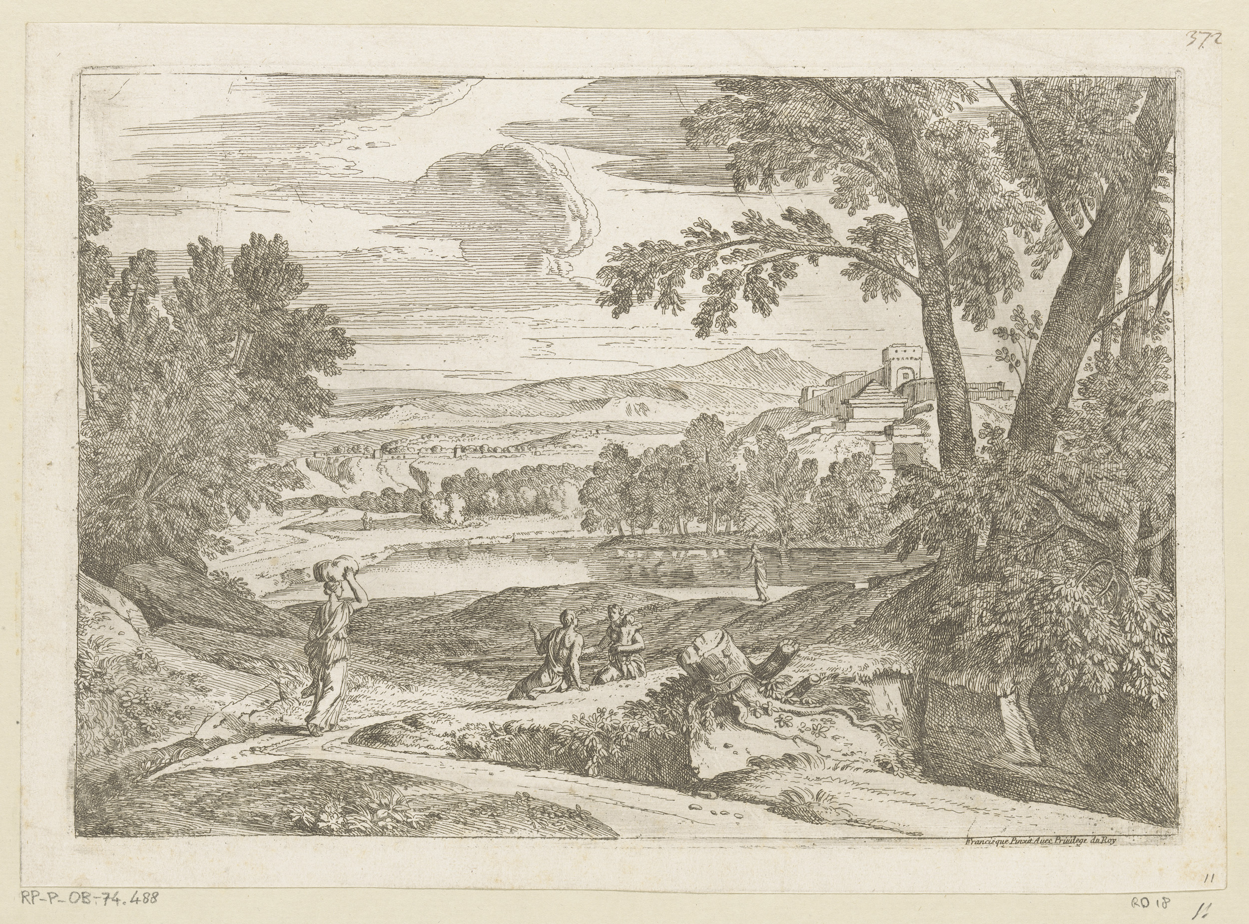 Arcadisch landschap met een vrouw bij een vaas gezet...