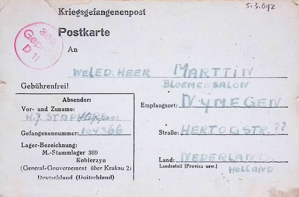 Kriegsgefangenen Postkarte - d.d. 3-12-1943 van J. S...
