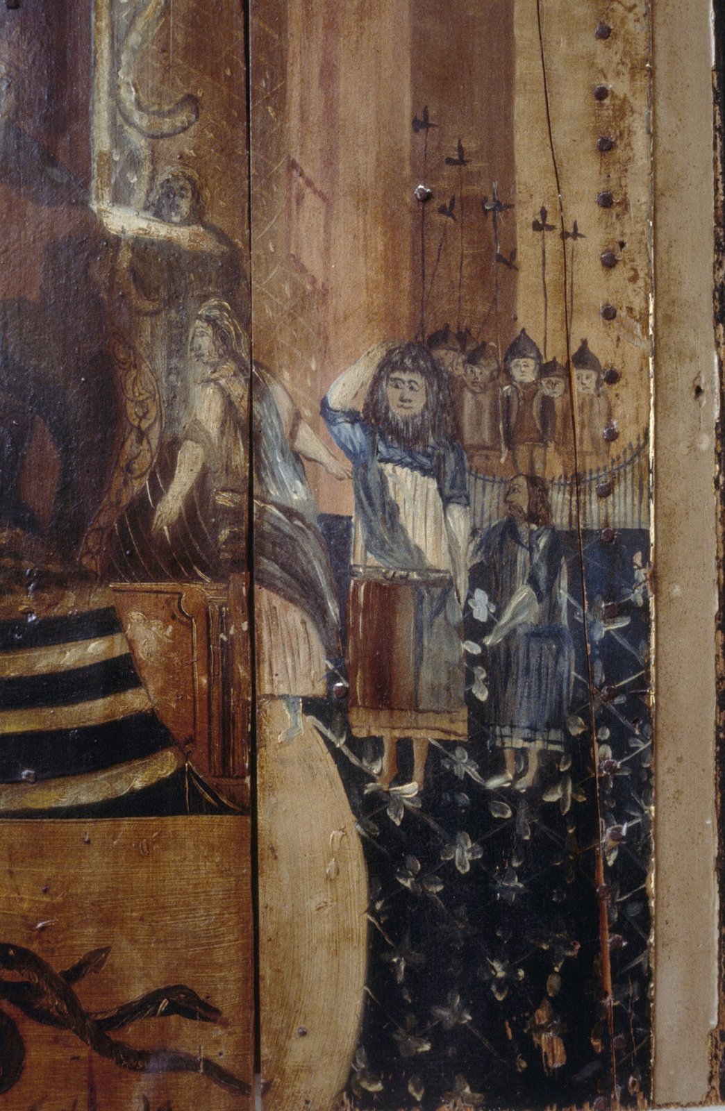 Interieur, beschilderde luiken, detail tijdens vrijl...