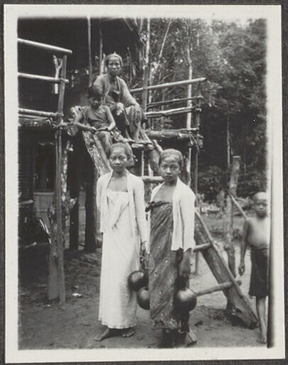 Vrouwen op Palembang met kalebassen om water te gaan...
