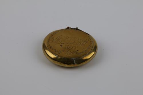 Ronde koperen tabaksdoos met inscriptie