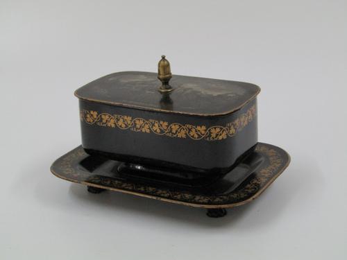Ronde tinnen tabakspot met beschilderd deksel