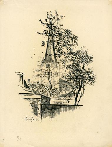 Tekening met potlood van de toren van de Martinikerk...