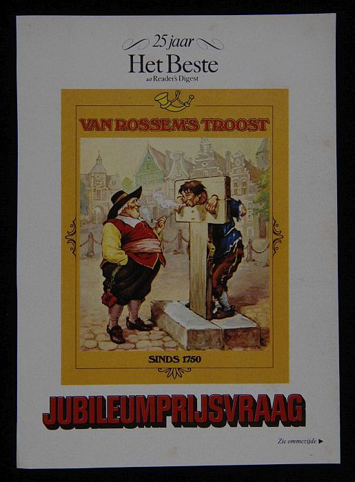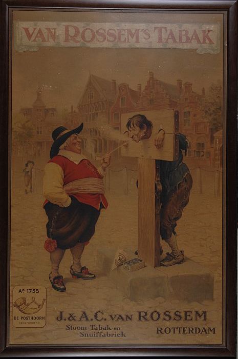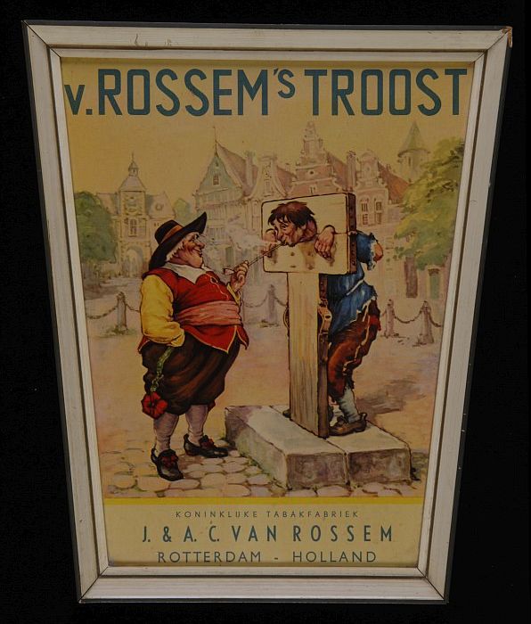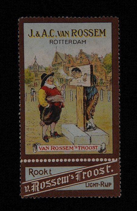 Reclamebord met man aan schandpaal met "van Rossem´s...