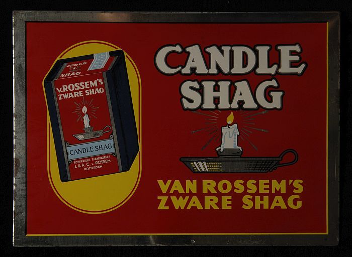 Reclamebord met "CANDLE SHAG v. Rossem's ZWARE SHAG"
