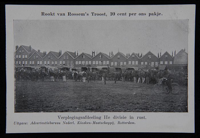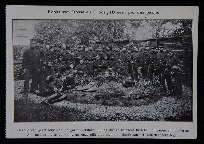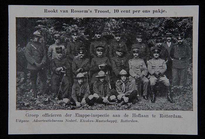 Briefkaart met officieren en "rookt Van Rossem ´s Tr...