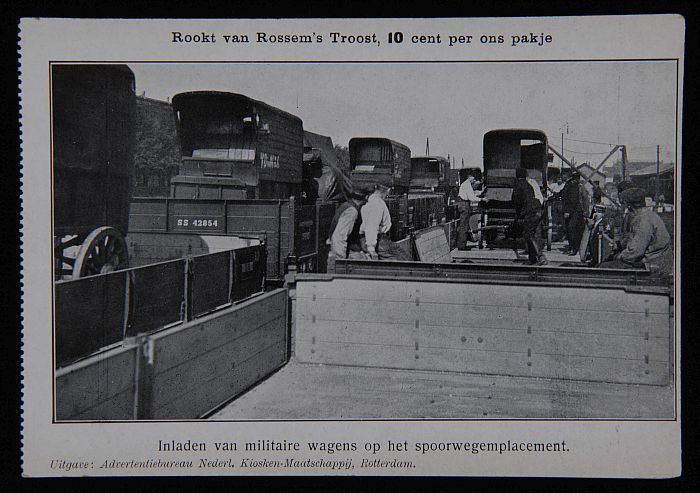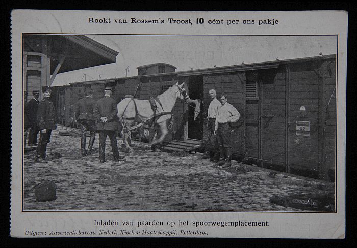 Briefkaart met soldaten bij inladen van paarden op s...