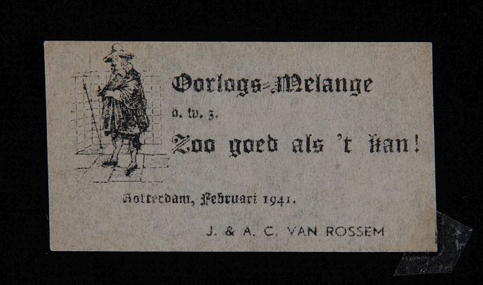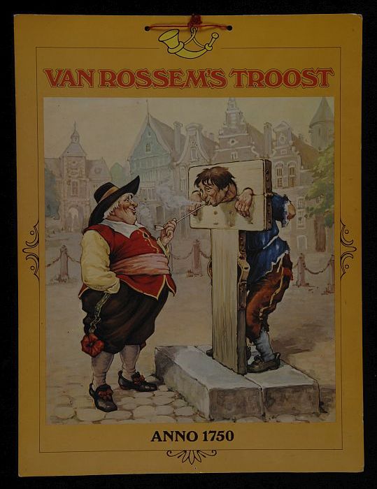 Flyer met man aan schandpaal en "Van Rossems TROOST ...