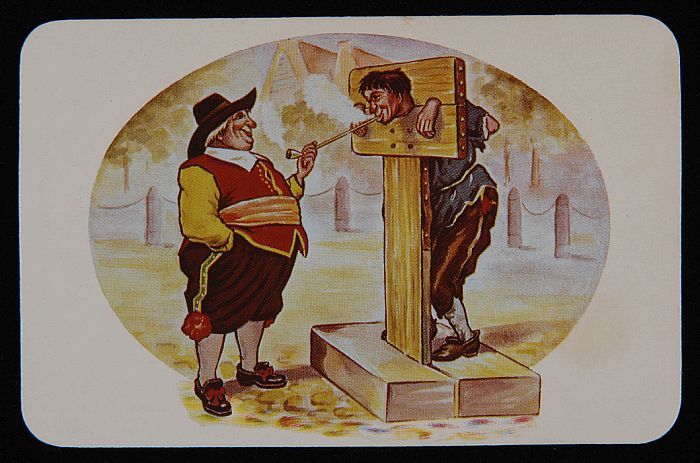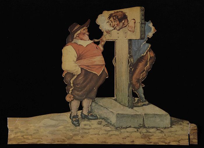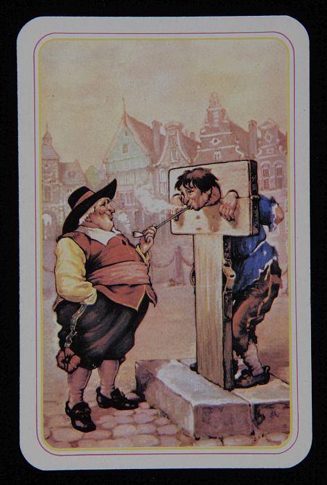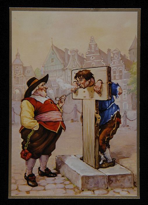 Briefkaart met man aan schandpaal en "VAN ROSSEM'S T...