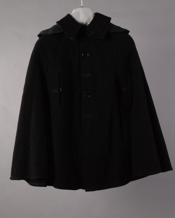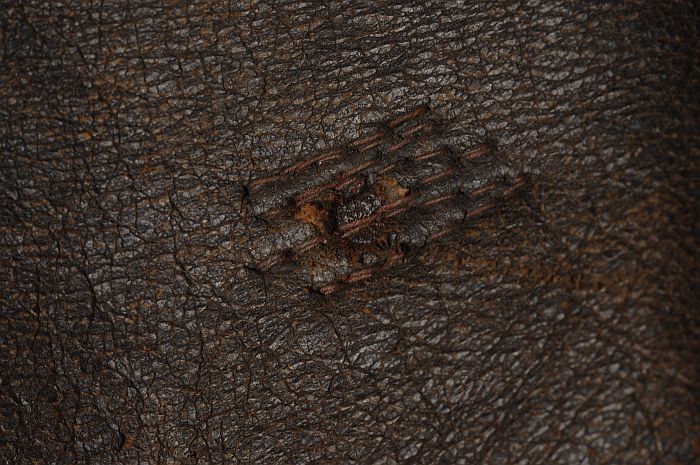 Lange jas van bruin leer, met dichtgenaaide kogelgat...