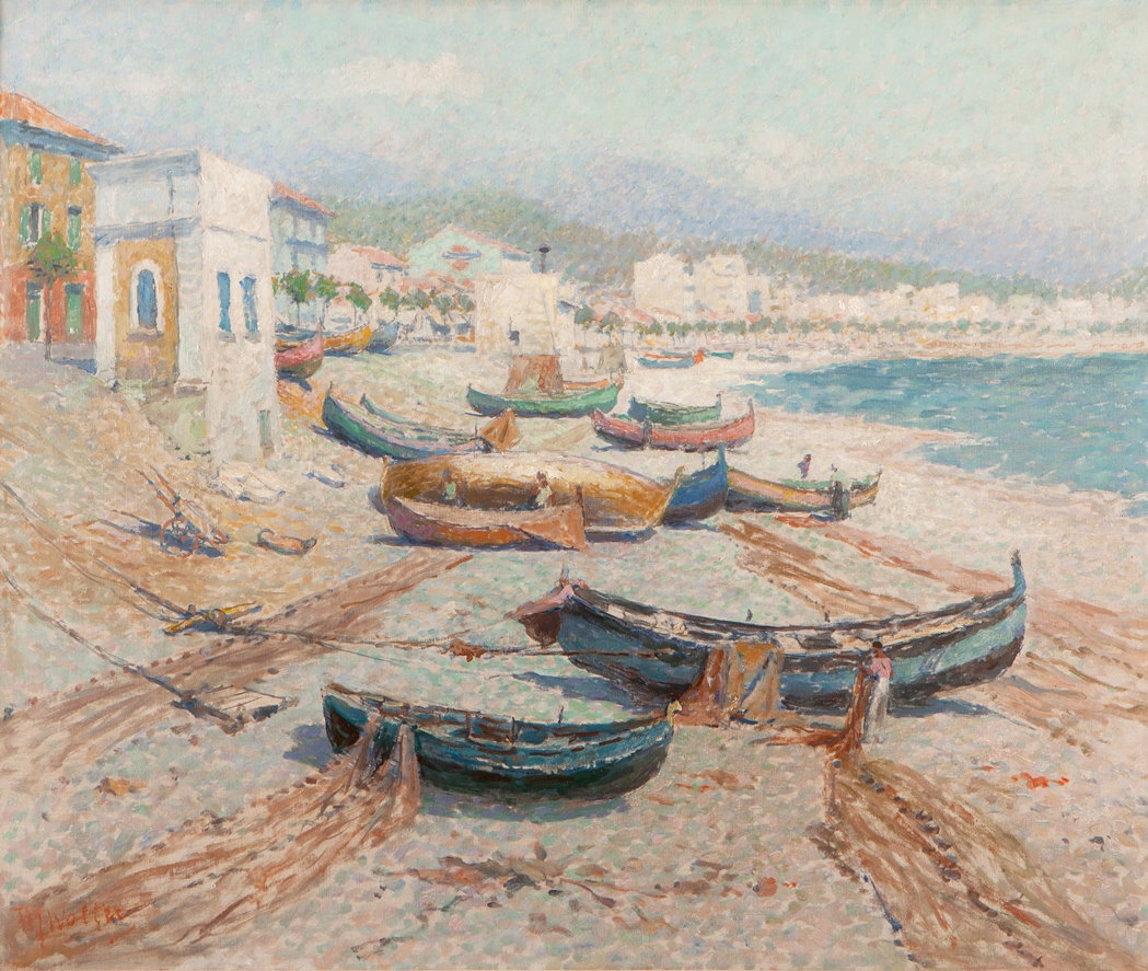Strandgezicht met vissersboten te Nice