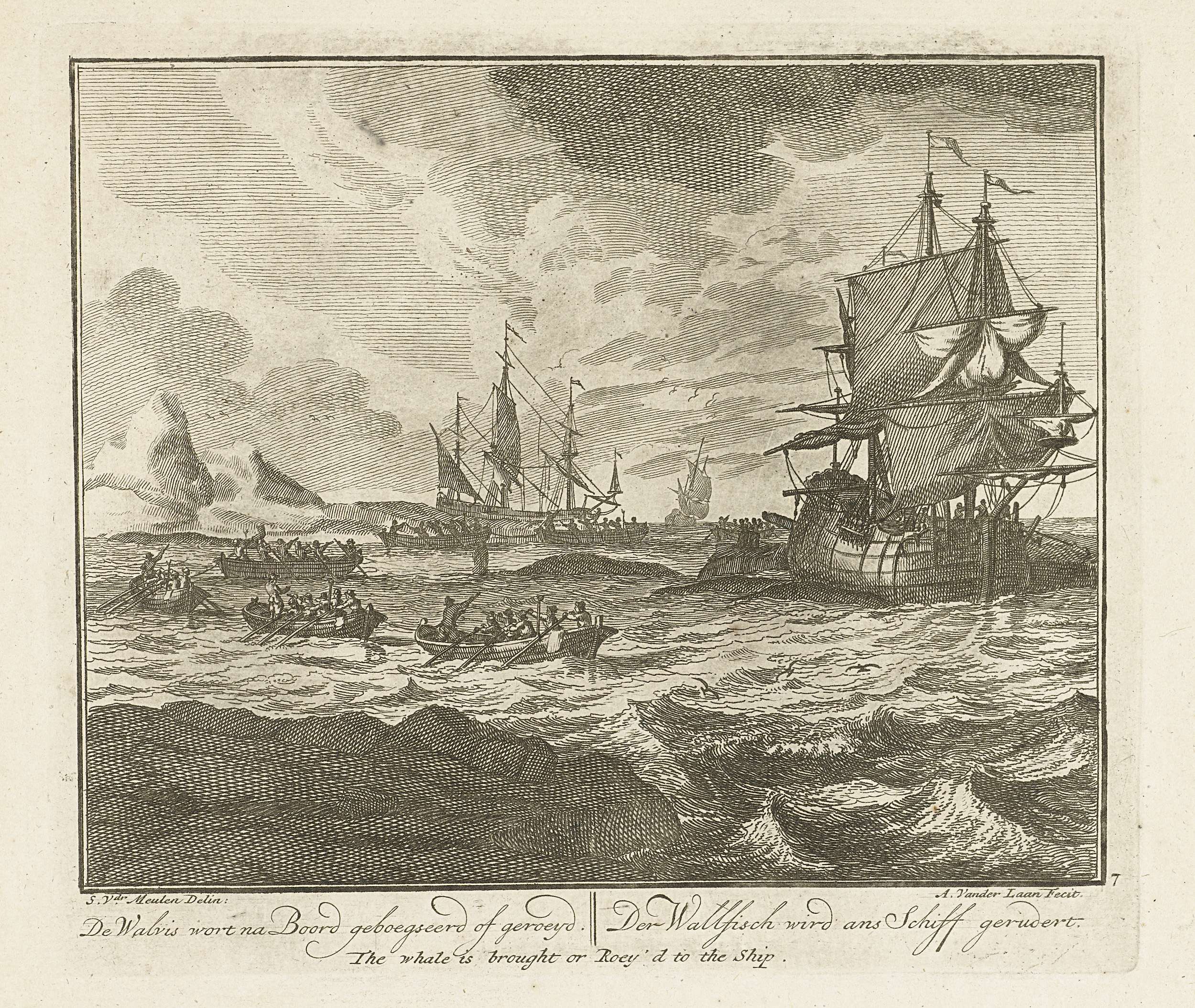 De walvis wordt langszij het schip gebracht, ca. 1725