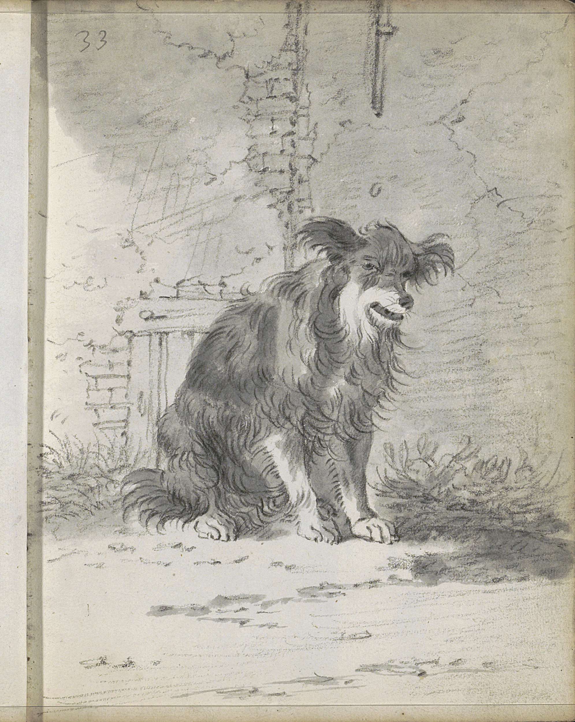 Zittende hond bij een muur