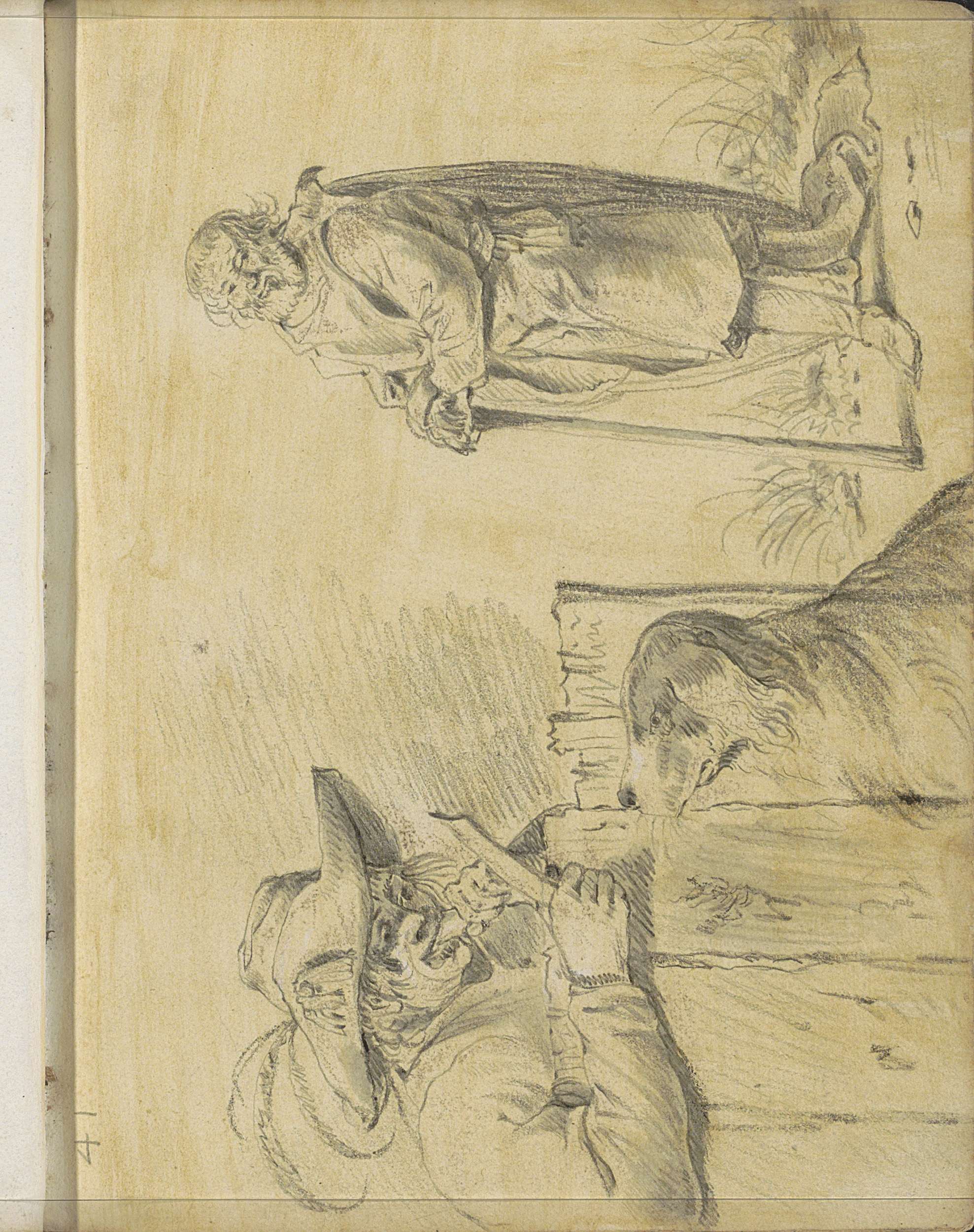Etende man met hond en een wandelaar met staf