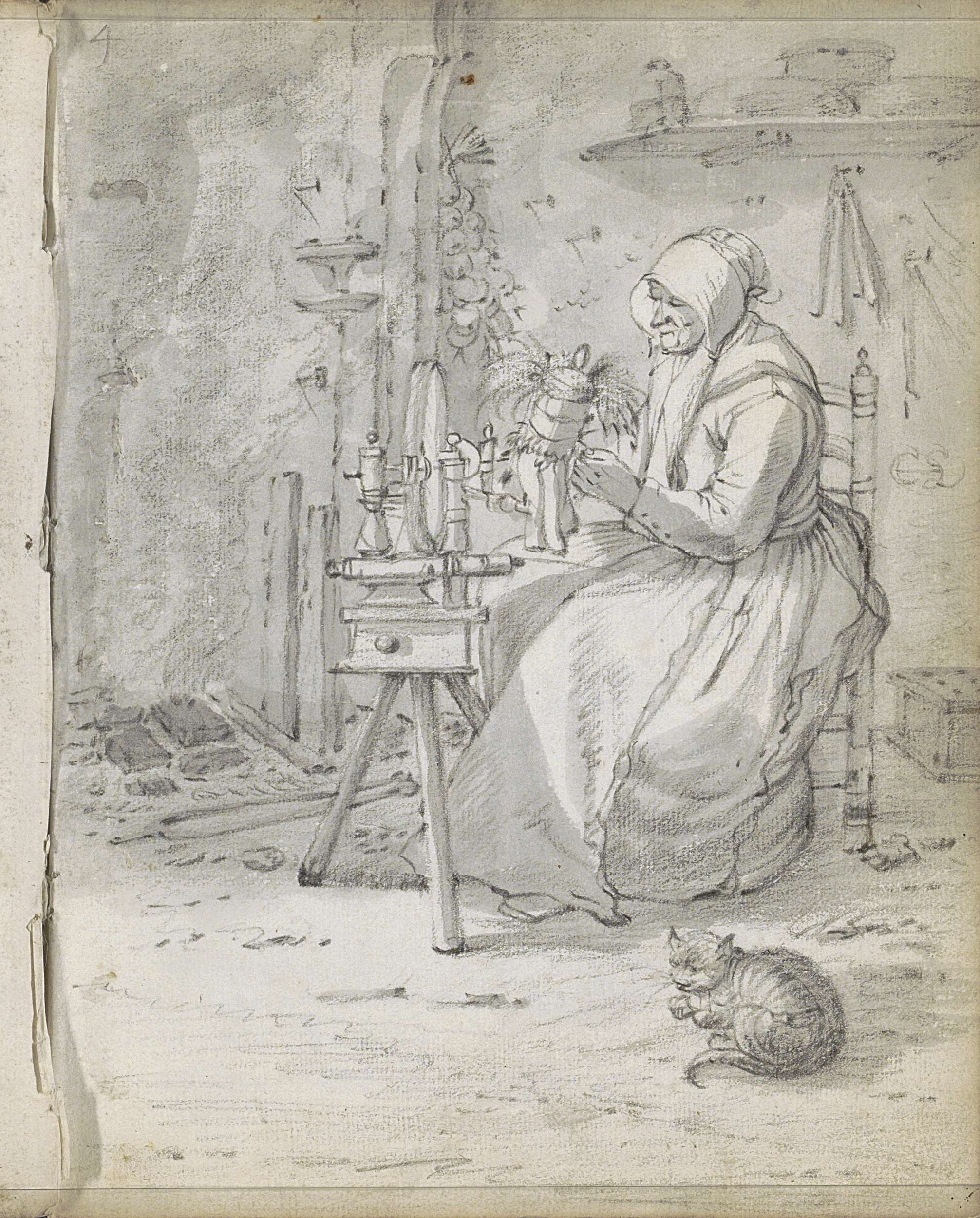Boereninterieur met een vrouw aan een spinnewiel