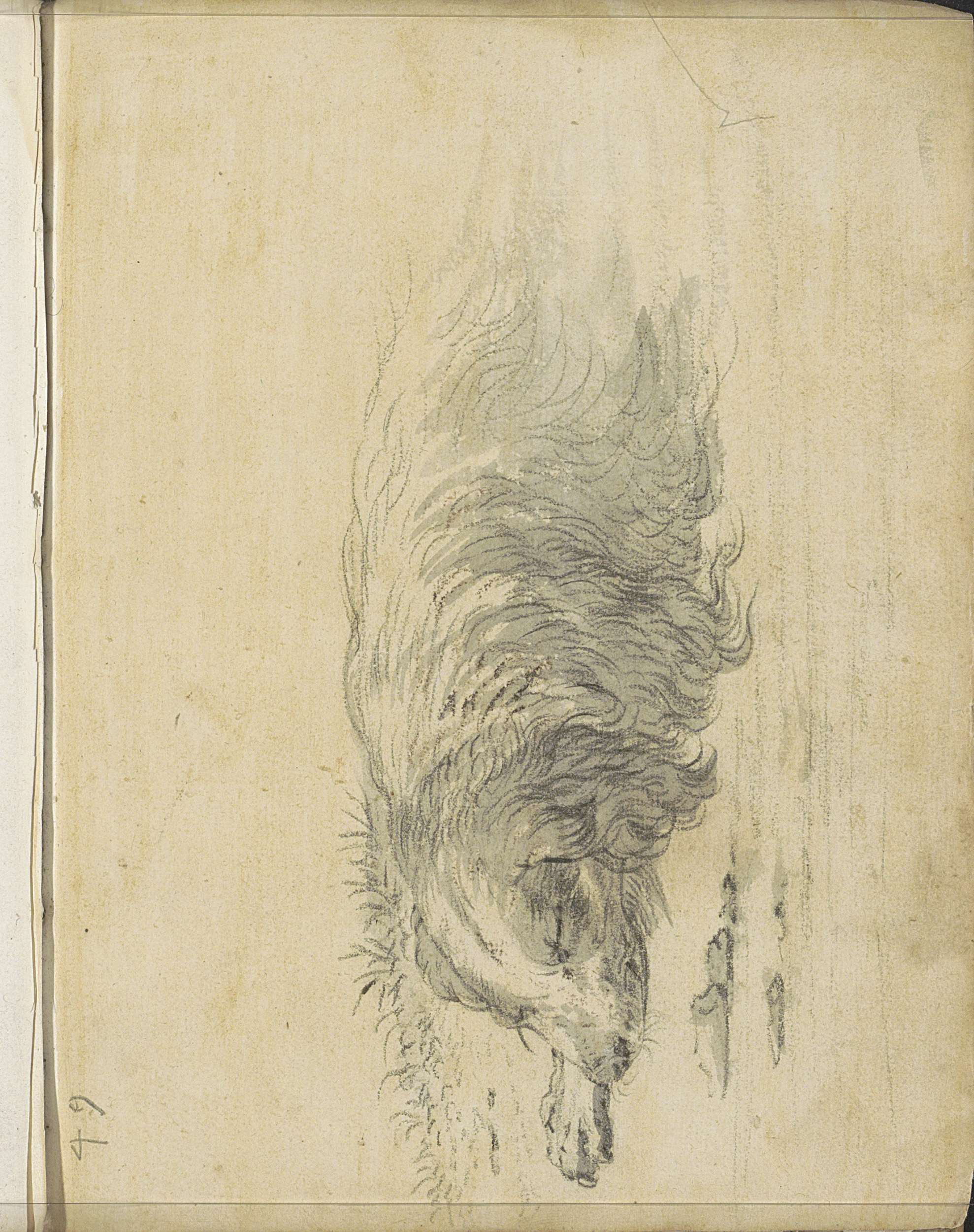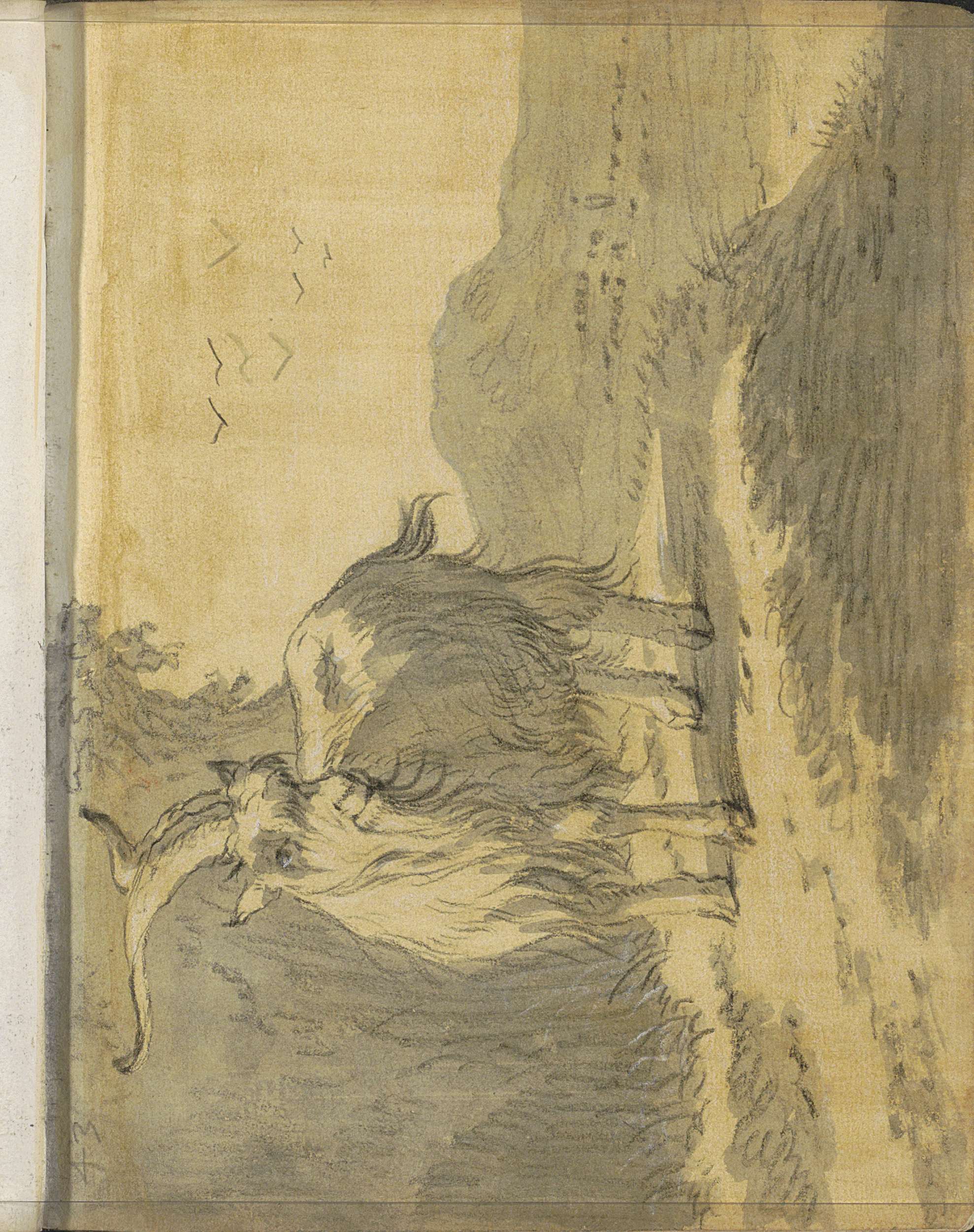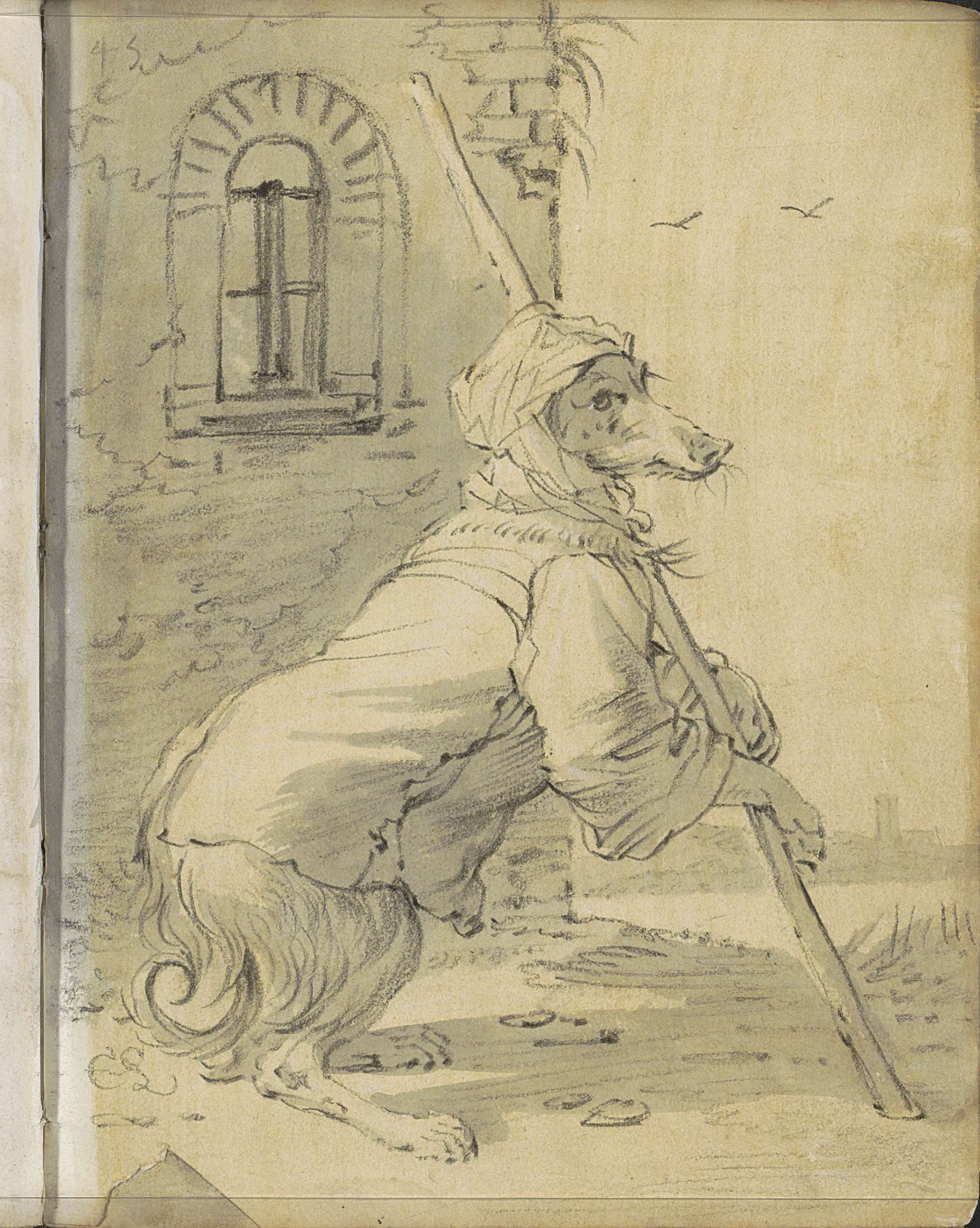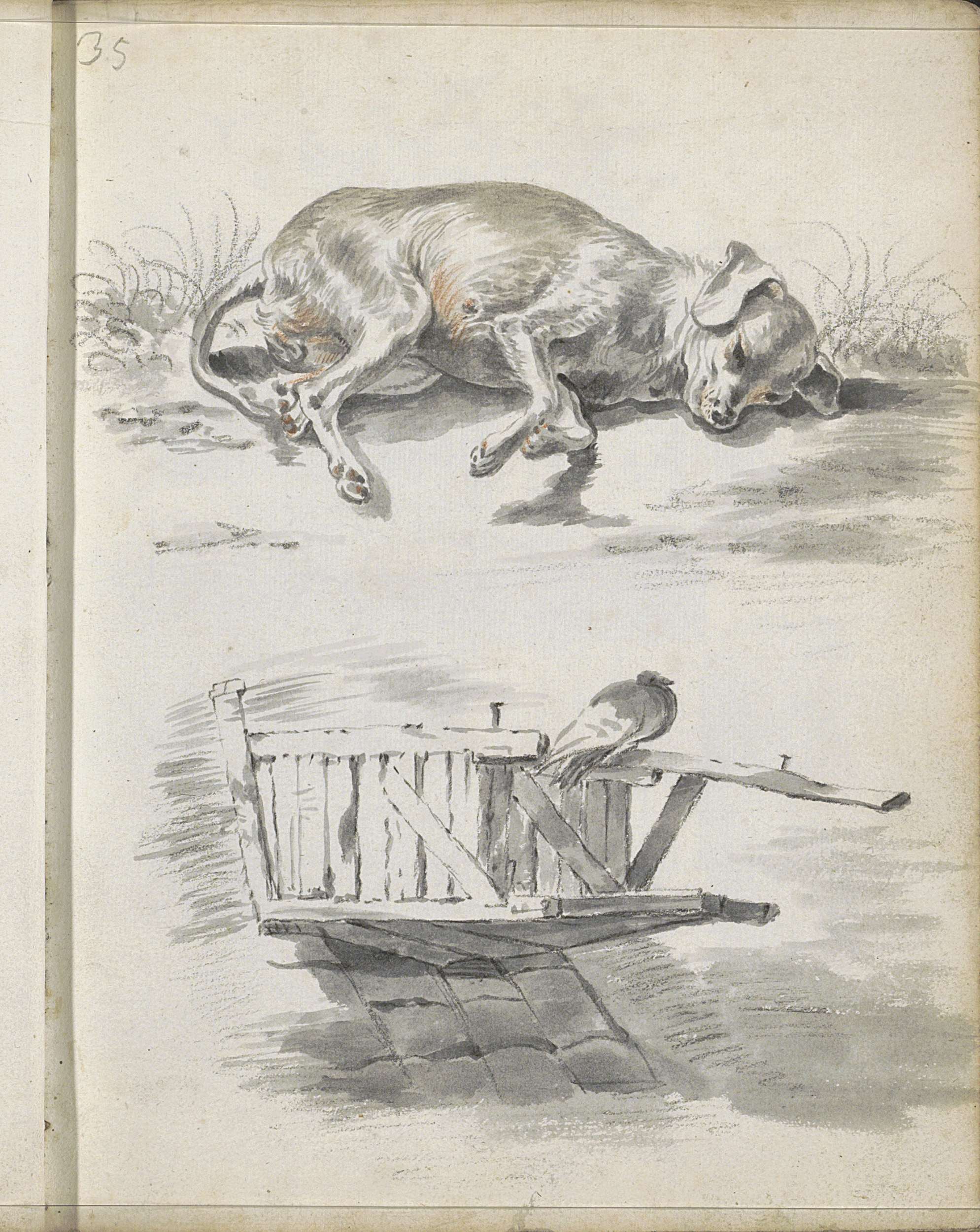 Liggende hond en een duif op een duiventil