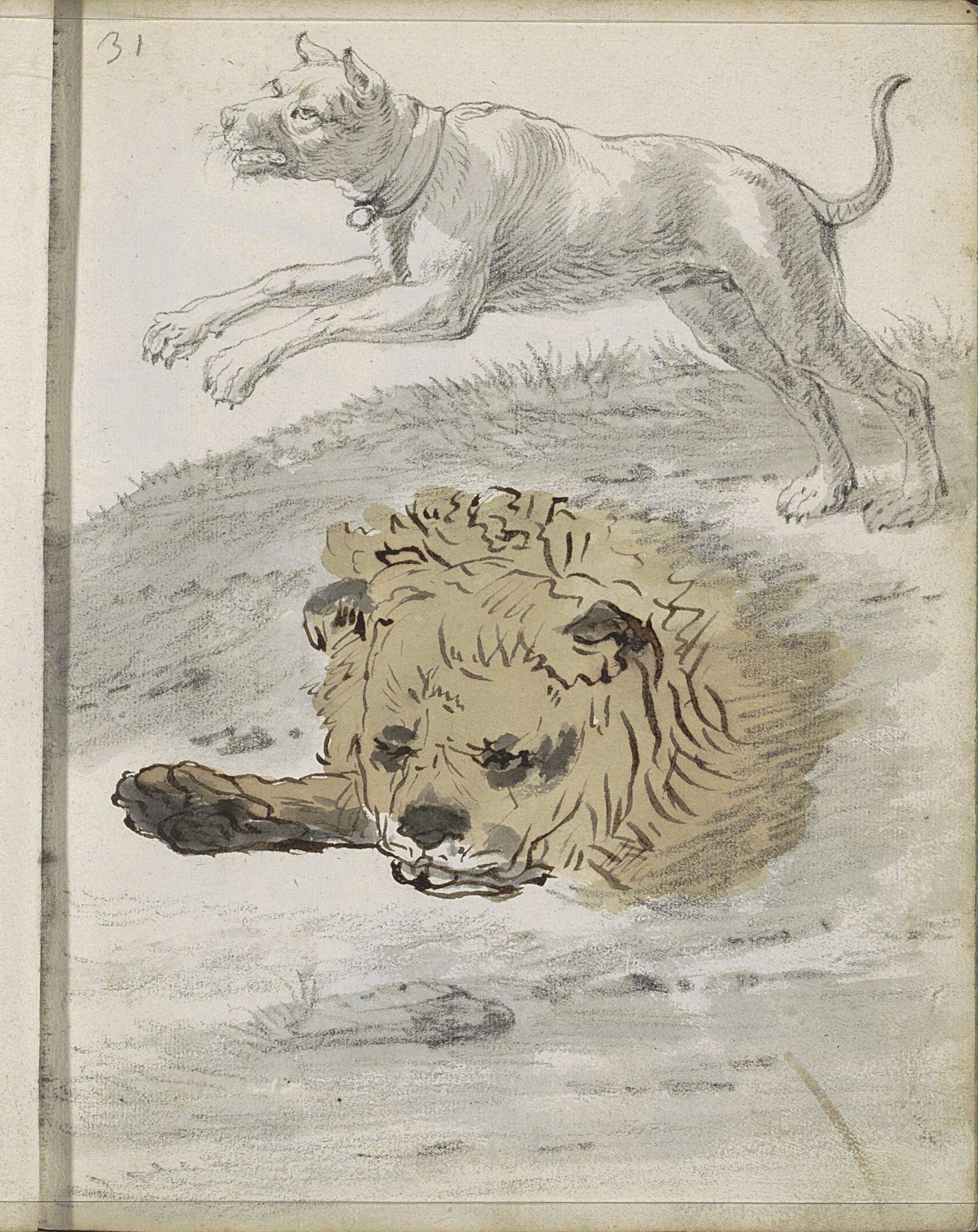Springende hond en de kop van een leeuw