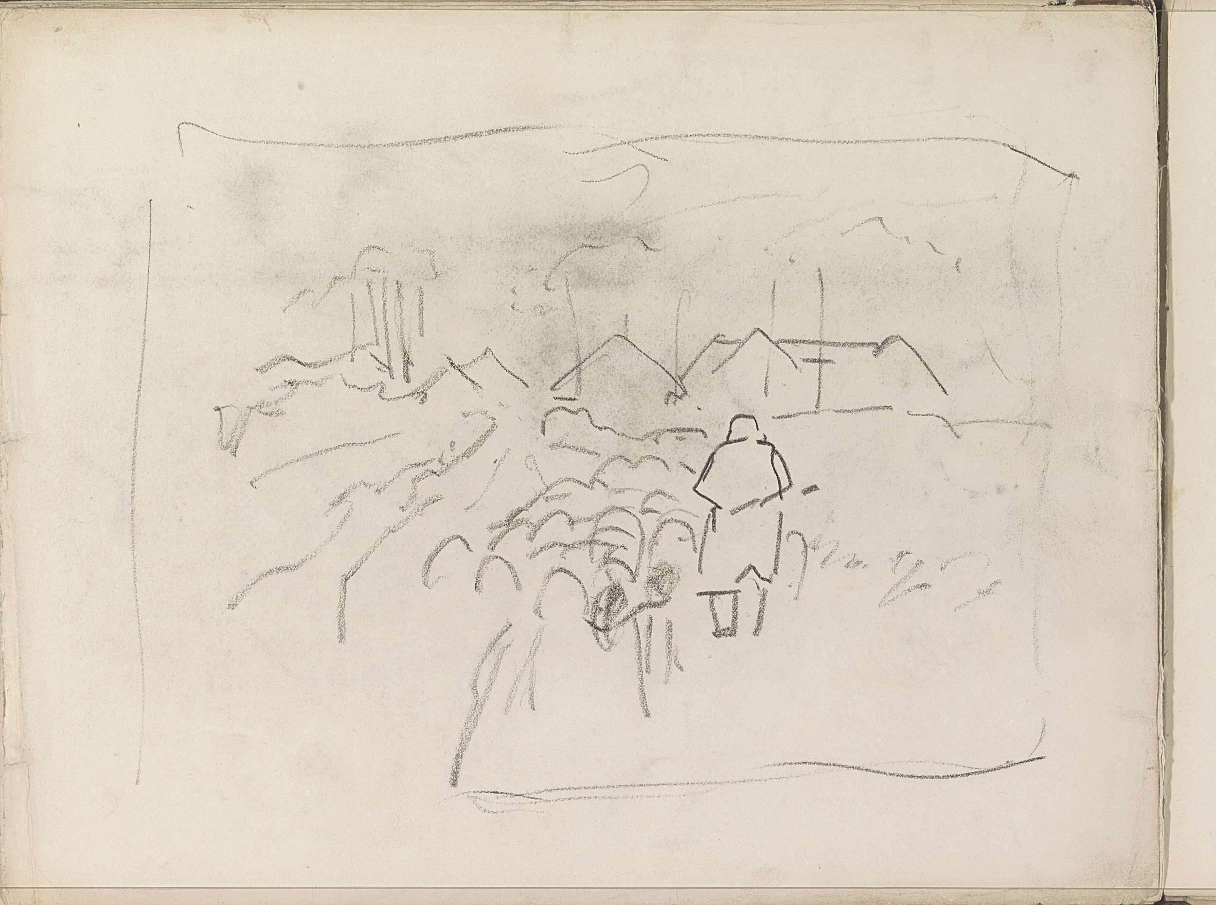 Vrouw naast een mand in een landschap