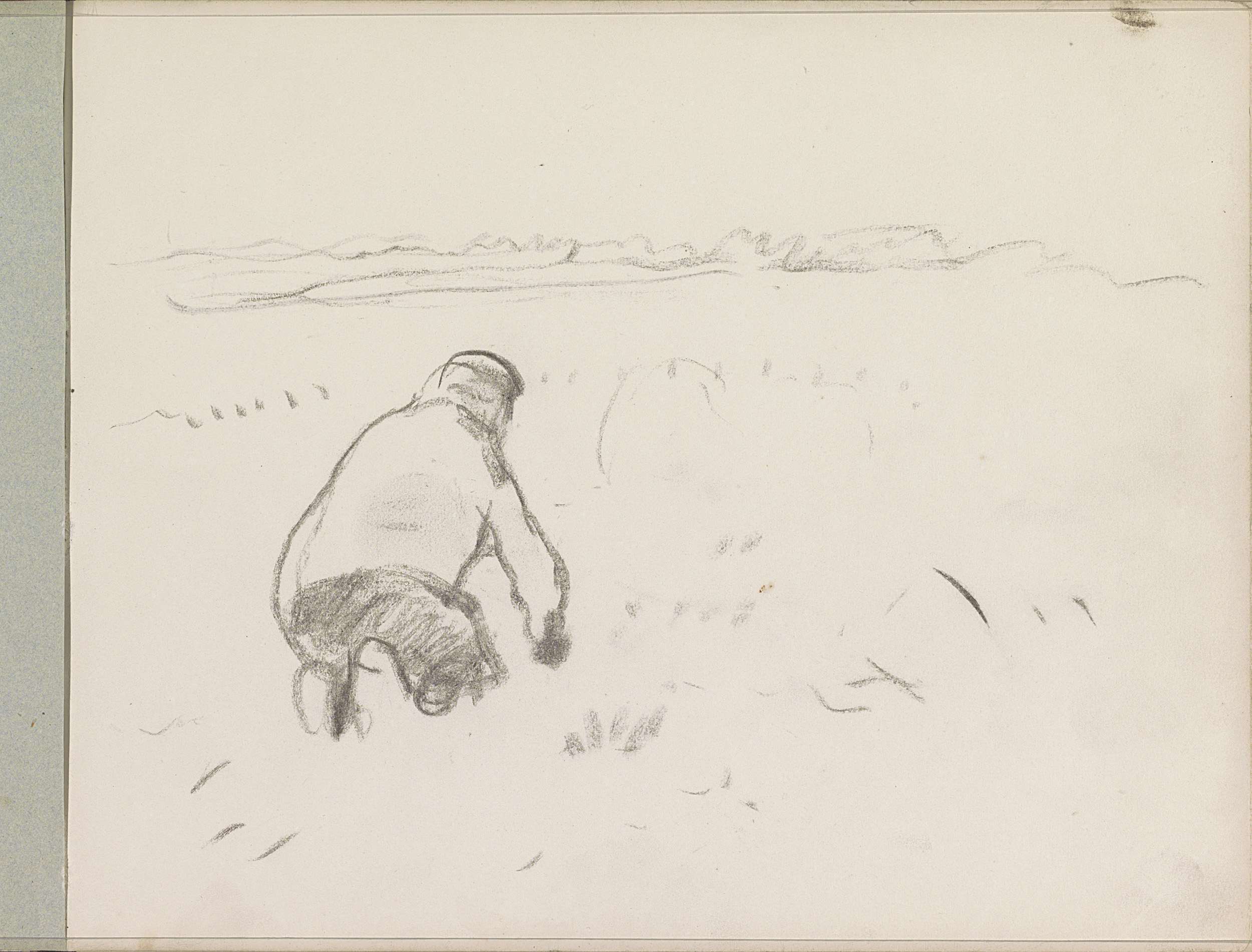 Hurkende aardappelrooier op een veld