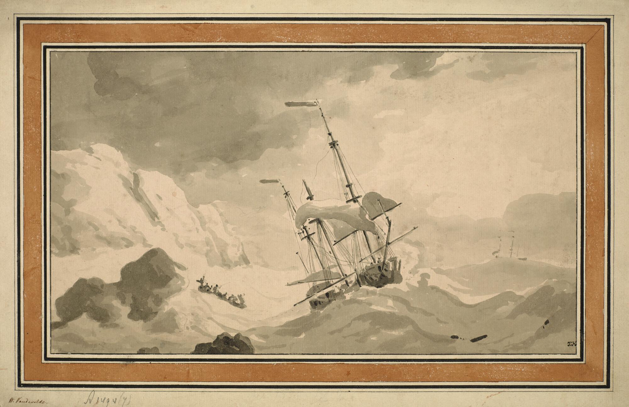 Oorlogsschip in zwaar weer nabij een rotsachtige kust