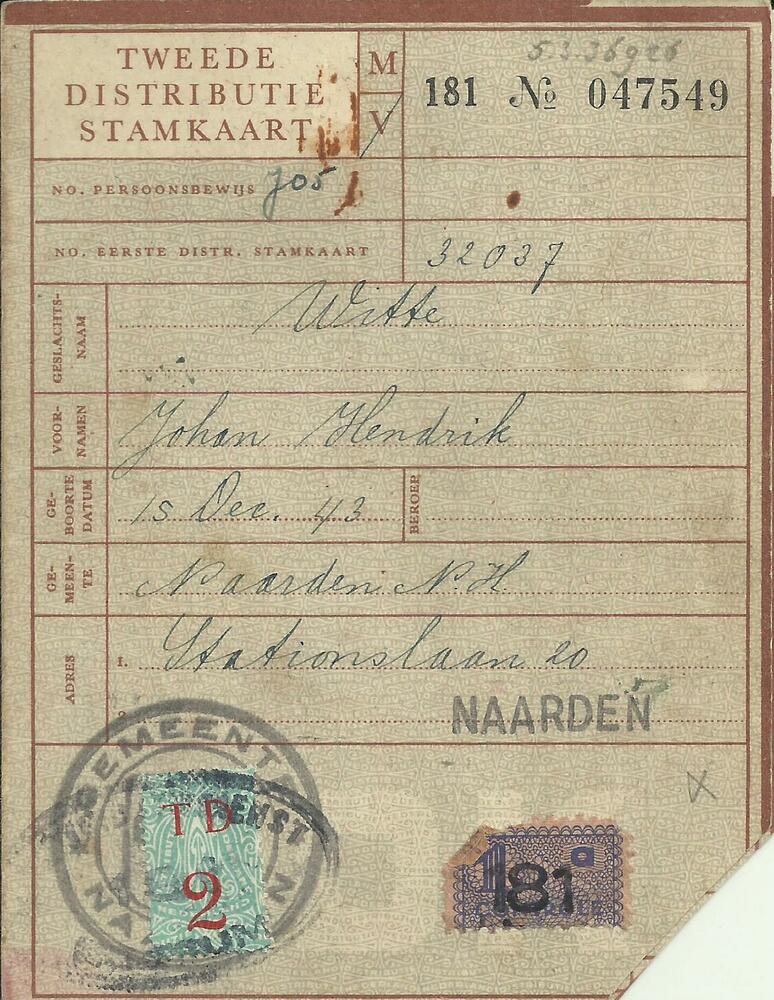 Tweede Distributiestamkaart op naam van Witte, Johan.