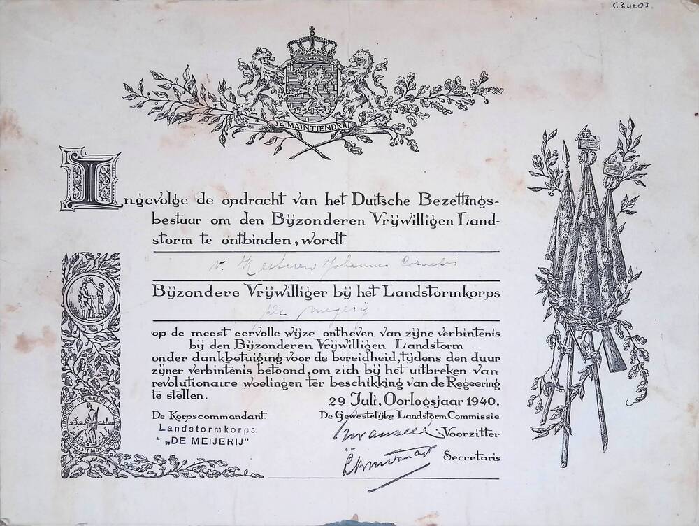 Certificaat van eervol ontslag van Johannes Cornelis...