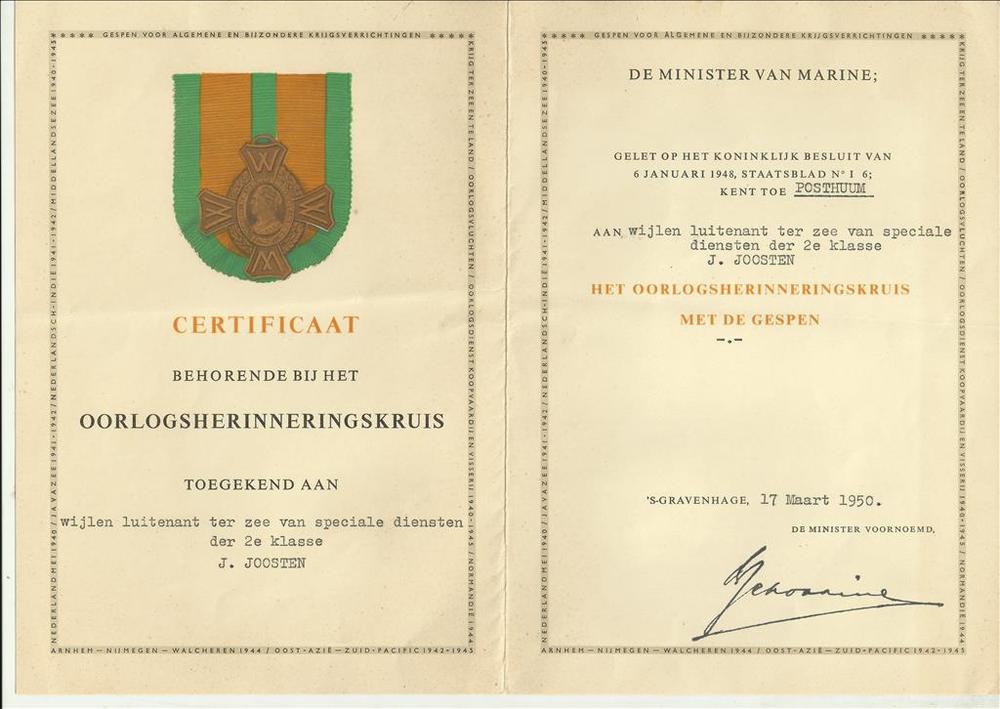 Certificaat behorende bij het Oorlogsherinneringskru...