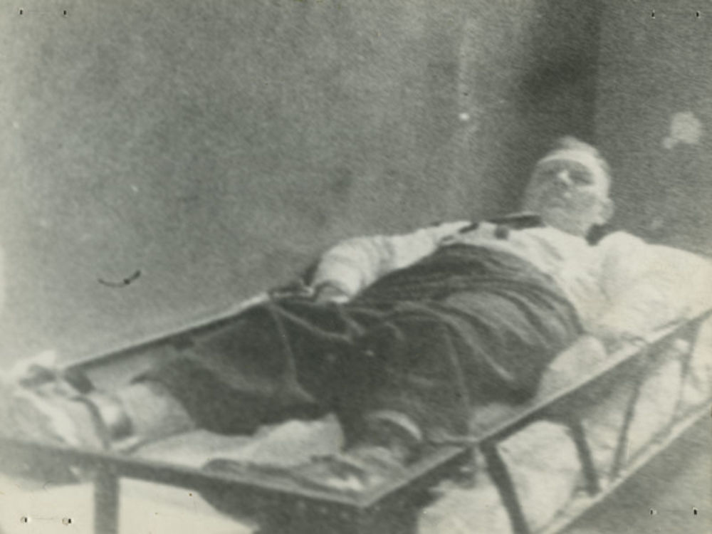 Foto aan bed vastgeketende man. Tekst achterop: "Hie...