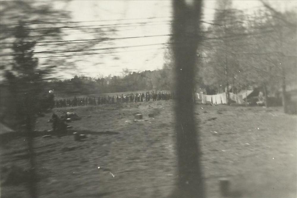 militair kampement met rij militairen en drogende was