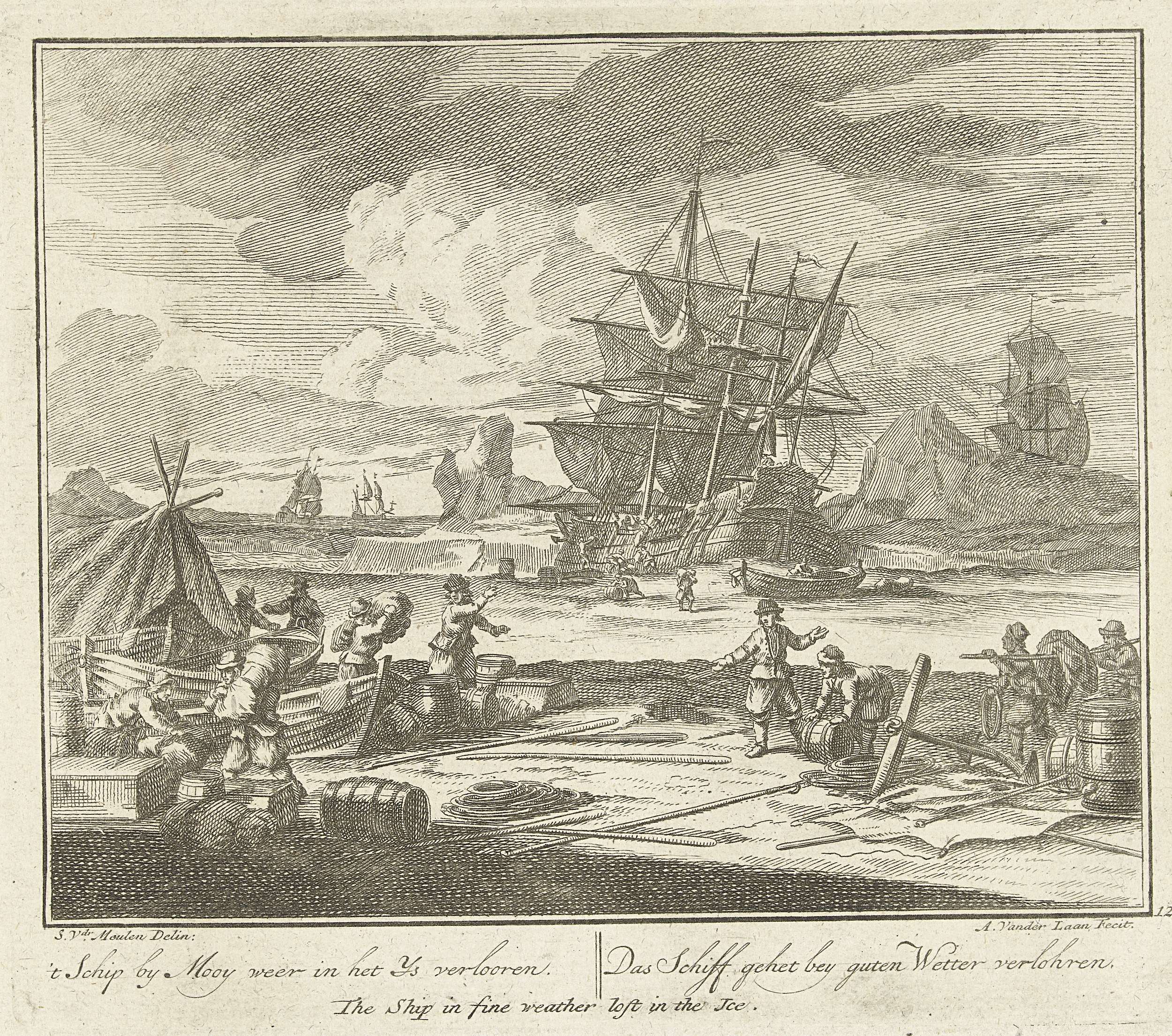 Schip raakt bij mooi weer vast in het ijs, ca. 1725