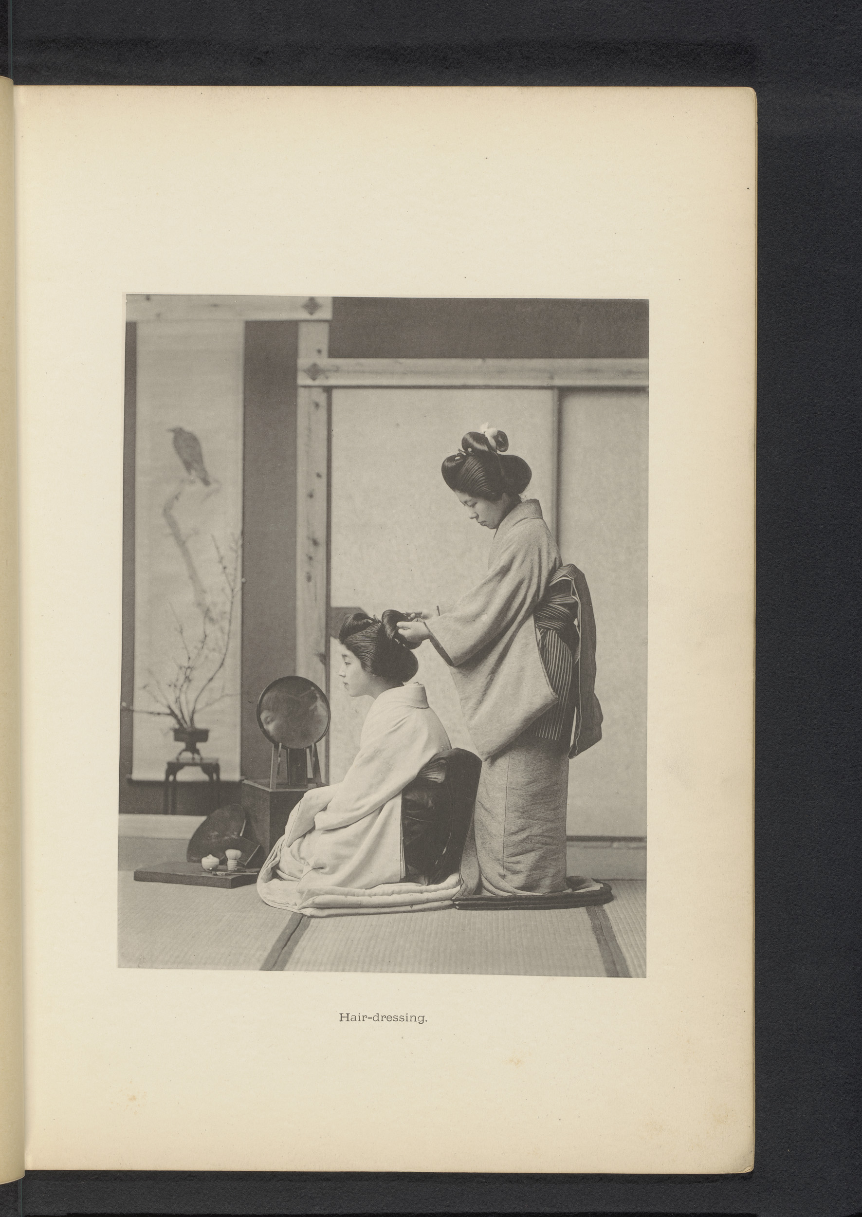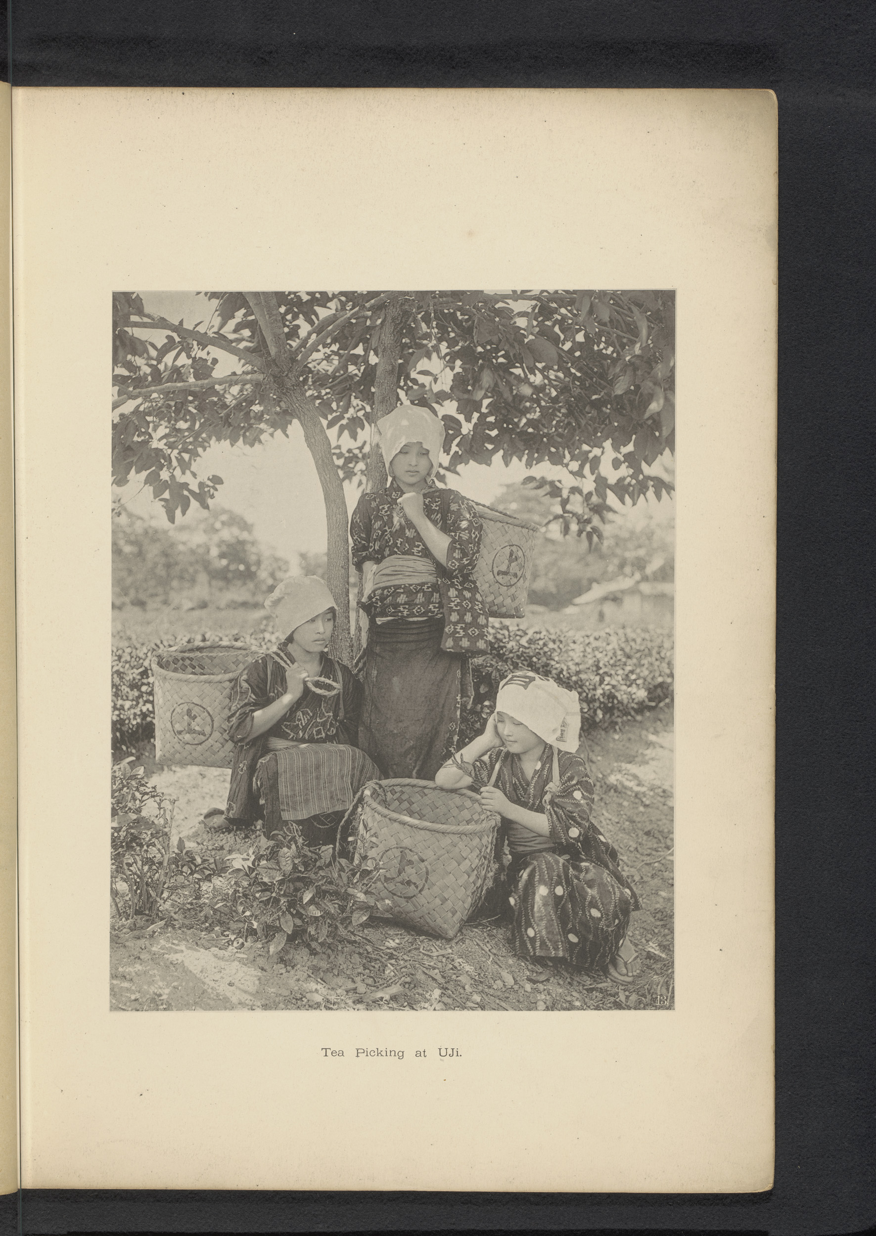Drie jonge vrouwen plukken thee te Uji
