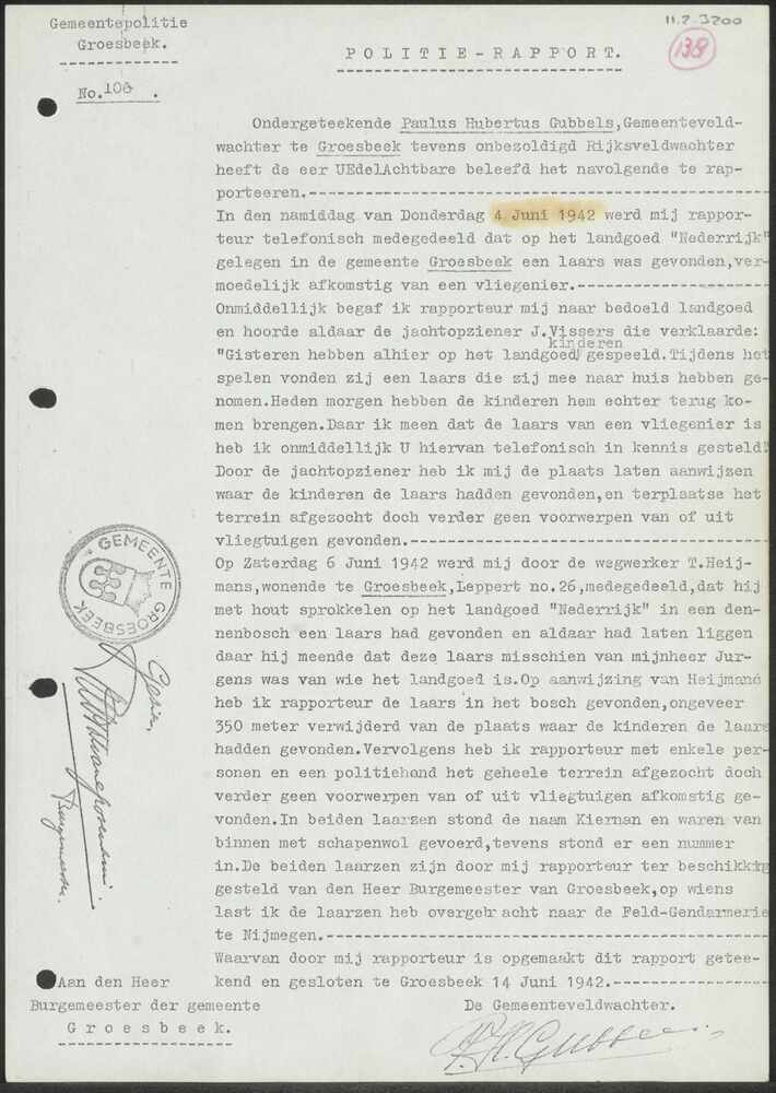 Politie-Rapport gemeente Groesbeek 14-06-1942.
